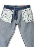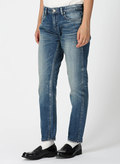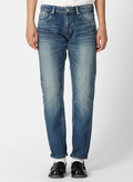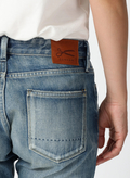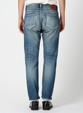 長くはきこんだようなユーズドライクな風合いが魅力のデニムパンツ。やや前ぶりのサイド切り替えと裾に向かって細くなっていくカーヴィーなシルエットが特徴。程よくゆとりを持たせつつ、レッグラインをすっきりとした印象にみせてくれます。バックのシザーモチーフ刺しゅうとレザーラベルもポイントです。
