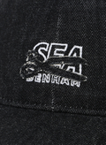 WIND AND SEA とのコラボレーションアイテム。コラボロゴの刺しゅうとシザーモチーフのアップリケが施されたデニムキャップ。ベーシックな6パネルデザイン。バックのベルトで好みのフィット感にサイズ調整することができます。ブラックデニムがクールな表情を演出するアイテムです。