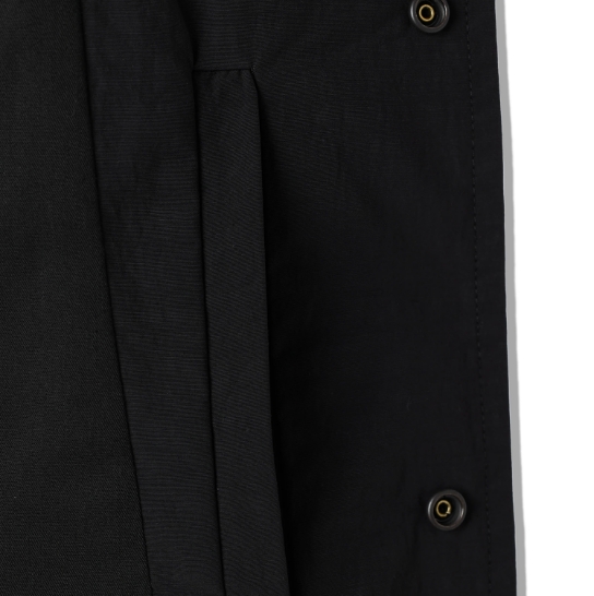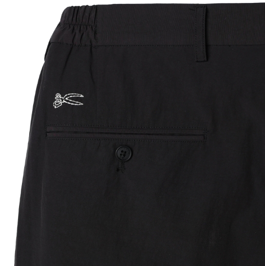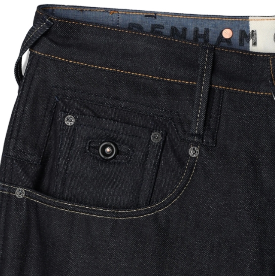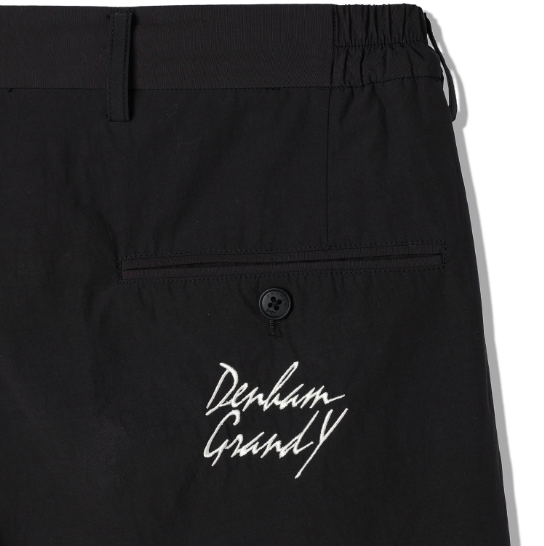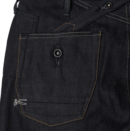 DENHAMを代表とするモデル“CROSSBACK”を採用。片脚を1枚布で縫製する特殊なパターンと随所に散りばめられたワークディテールが特徴的なテーパードシルエット。ヨーク部分とフロントにコラボレーションの刺繍を、ウエスト内側のスレーキにも両ブランドの刺繍が施されている。今回のCROSSBACKは、経糸緯糸ともに米綿主体の糸を使用。綾が綺麗なのが特徴です。ムラ糸を使用することで平坦ではない面と、単一的ではない自然なタテ落ち感が楽しめます。