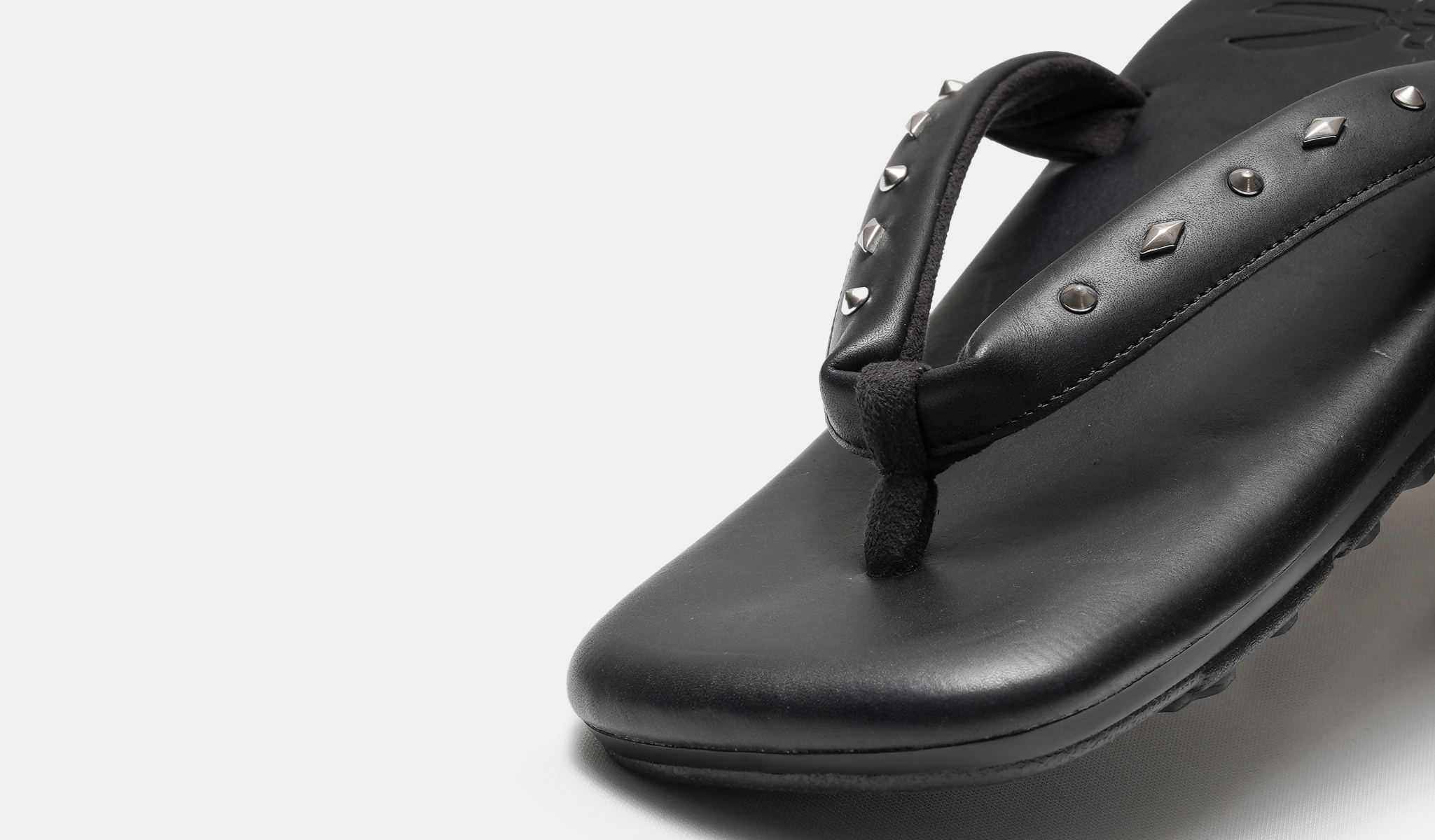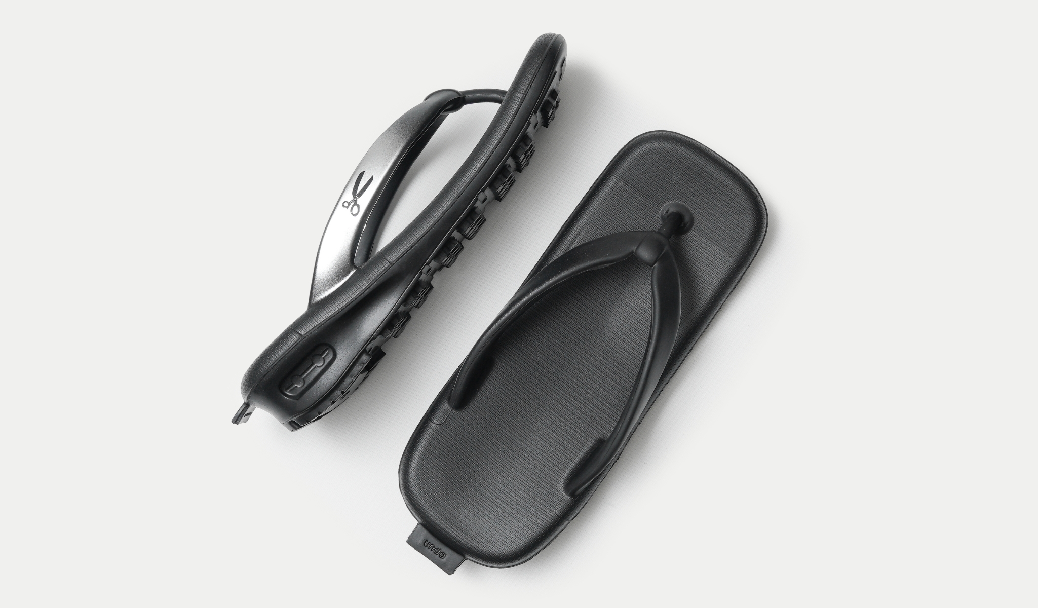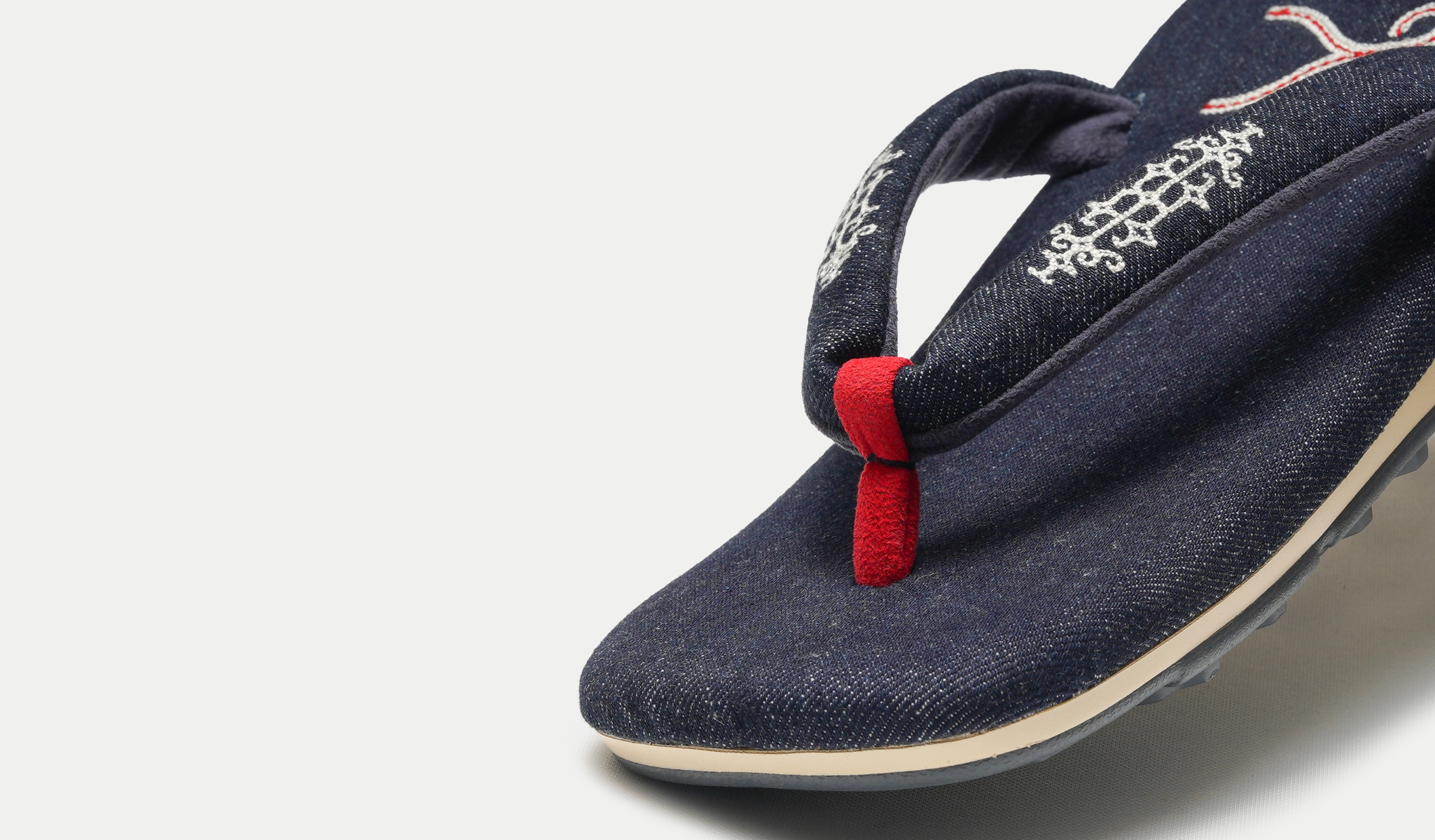 雪駄にはカカト部分に、ベタガネや馬蹄と呼ばれる鉄が付いていて、これをチャラチャラと鳴らしながら歩くのが粋な履き方です。しかし、これは現代の路面などでは滑りやすく、音も大きい等の問題が多いので今回はアウトソールのデザインにその要素を落とし込みました。アウトソールデザインは、七福神の一神でもあり、財宝や福徳をもたらしてくれる毘沙門天さまの甲冑(よろいかぶと)に使われている毘沙門亀甲を採用。足元に鎧を装備するかのごとく、タフで軽快な商品を表しています。