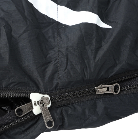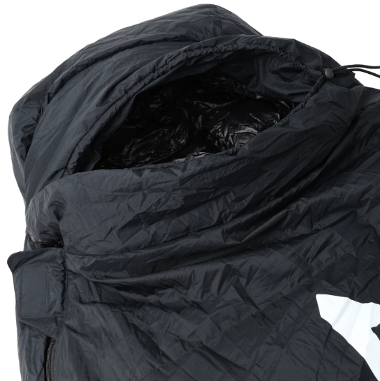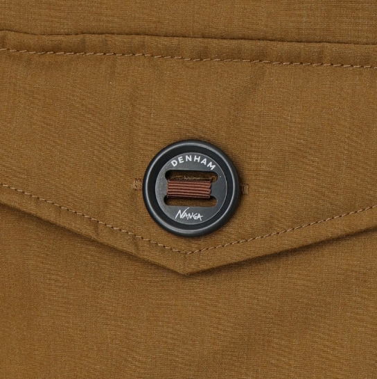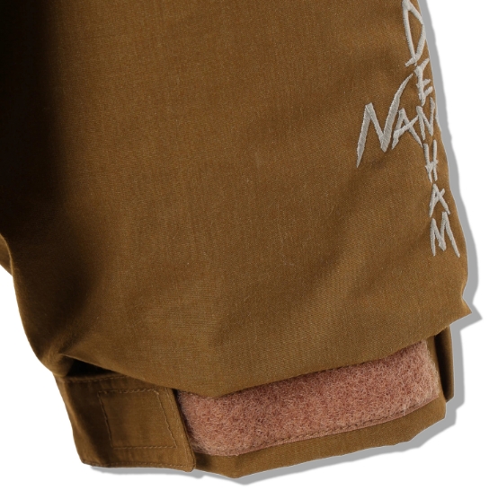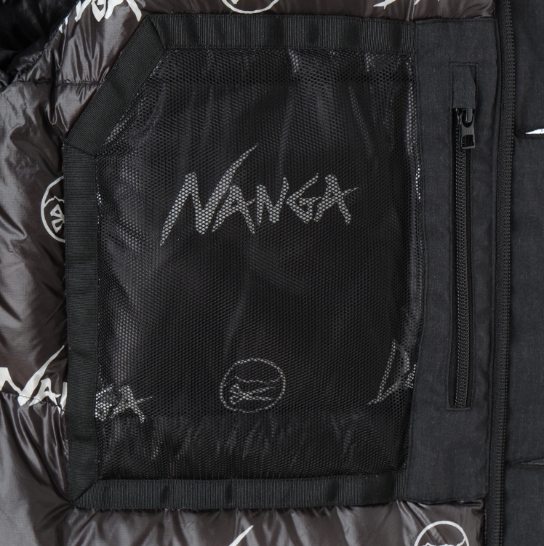 今シーズンのNANGAコラボレーションアウターは、コットンライクなポリエステル生地に難燃素材アラミドを配合したNANGA独自の“HINOC”をメインファブリックに採用したダウンジャケットとなっています。難燃素材では弱いとされる水や汚れなども考え、NANGA独自の考えに基づきアラミド繊維とポリエステルのバランスを考え混率で混合することで、丈夫さと高い難燃性を持ち、焚き火によって舞う火の粉の影響を受けづらく、さっと羽織ればインナーへのダメージを防ぎながらも水や汚れが沁みにくい仕様になっています。また、最高級のポーリッシュホワイトグースダウンを封入。裏生地には15dnリップストップナイロンを使用し、今作オリジナルグラフィックをデザイン。柔らかな着心地と、防水防風に優れた機能性も優れています。左袖にコラボロゴ刺繍、右袖にシザースステッチ刺繍、パラシュートボタンも本作オリジナルデザインです。