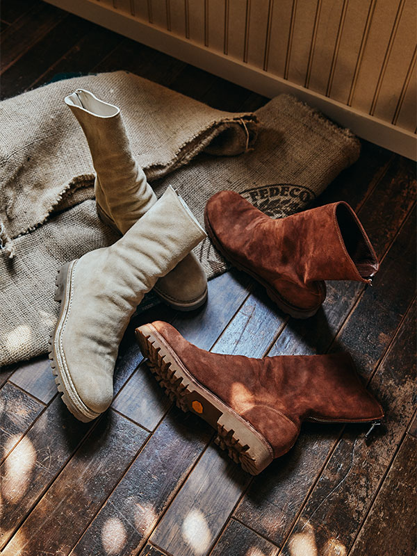 DENHAMからイタリア随⼀のレザーブランドGUIDIに別注をかけたBACK ZIP BOOTS。GUIDIのシグネチャーモデルである788Vをベースに、デニムとの相性を考えたBROWNとBEIGEのオリジナルカラーを2⾊展開。BABY BUFFALOのREVERSEを採⽤し、裏⾰だが⽑⽻が少なく柔らかい⾼級感のあるレザーとなっている。ソールはVIBRAM社のサステナブル商品「N-OIL HONEY」を使⽤したグッドイヤー・ウェルト製法。職⼈による昔ながらの製品づくりにより、長い時間履いても疲れない、また履き込むほどに⾜に馴染む最⾼のフィット感を感じられる。