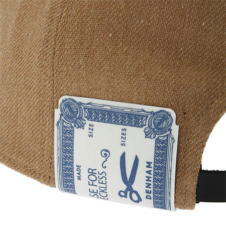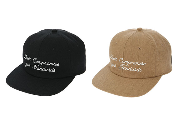 WOOL BASEの6PANEL CAP。フロントに生成り刺繍し、DON’T COMPROMISE YOUR STANDARD(妥協するな)というDENHAMのコンセプトメッセージを入れています。