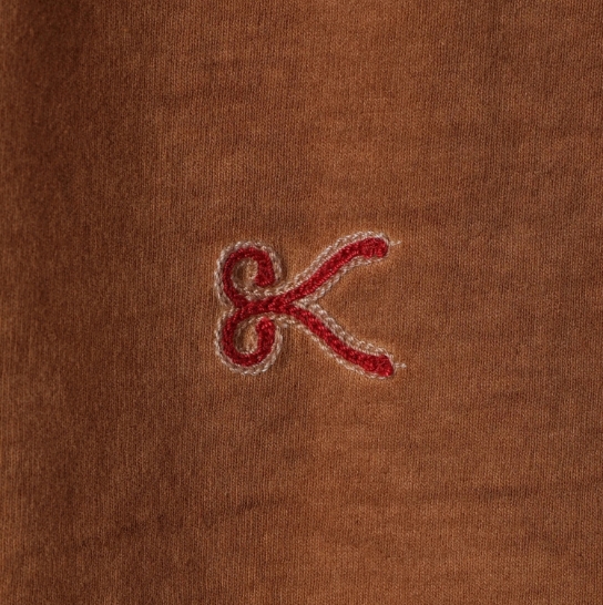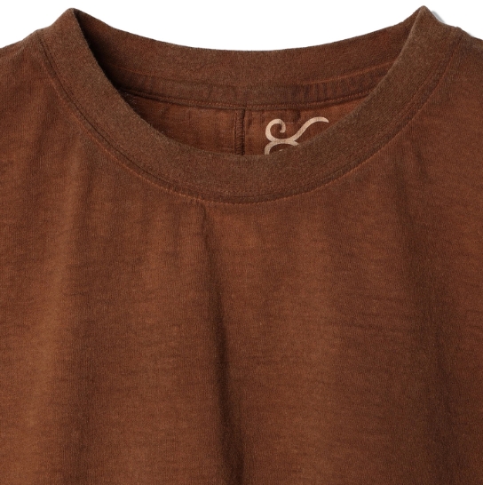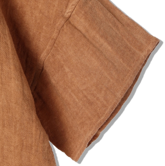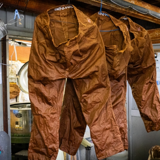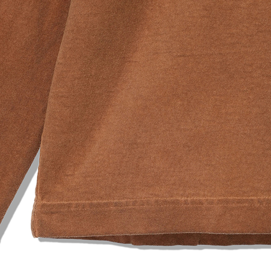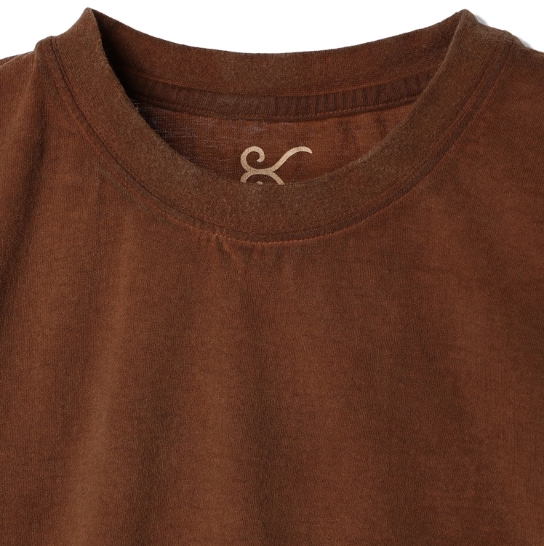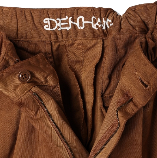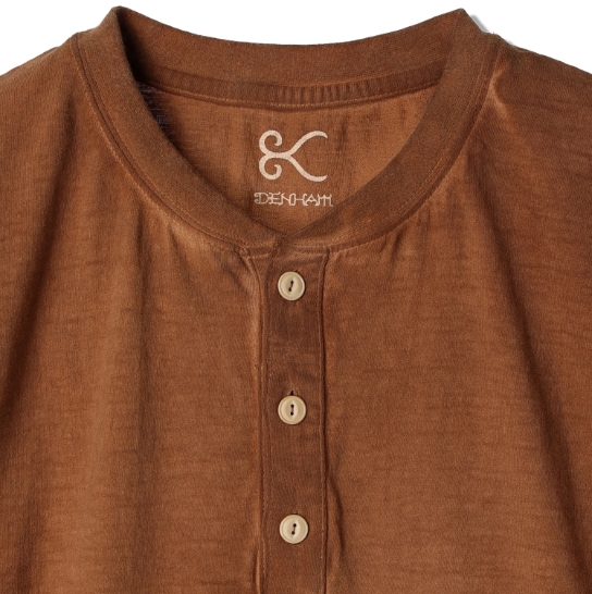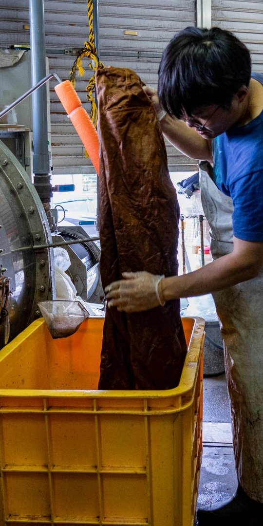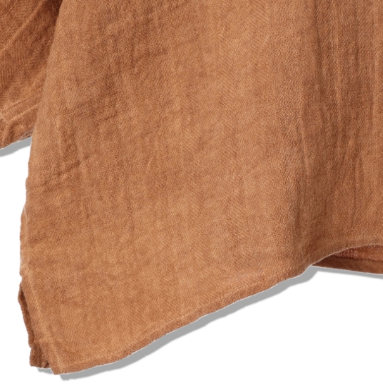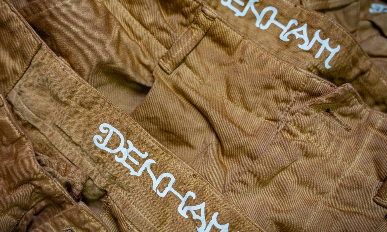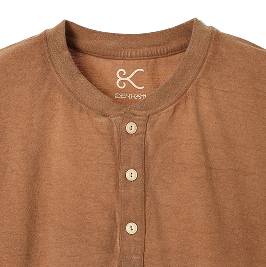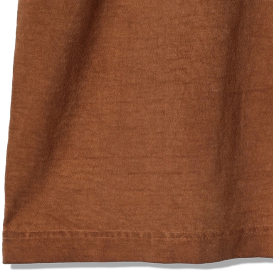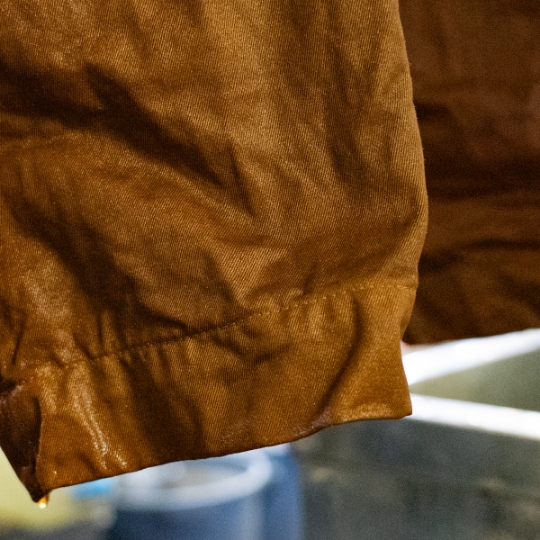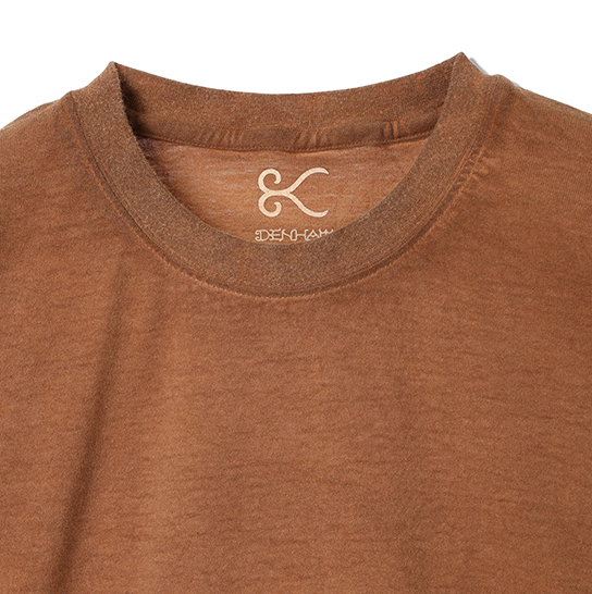 渋柿の未熟な果実を粉砕・圧搾・発酵・熟成させて得られる抽出液である「柿渋」の起源は、日本に伝来した平安時代に遡ります。「柿渋」に含まれる成分のタンニンが繊維や木材などに防水・防腐の効果をもたらすことから、日用道具・衣類・建造物・治療薬などに幅広く重用されてきました。日本では柿渋の茶色が伝統的な色として使われています。柿渋染めはインディゴのように使えば使うほど色が抜けていき変化していきます。DENHAMの柿渋染めは特別な方法で⾏われており、染色後、⼀旦水に最低限湿らせ上で、柿渋を表⾯にとどめてから乾燥させていきます。その工程を2~3回繰り返し、染める回数を重ねていき、色を濃くしていきます。