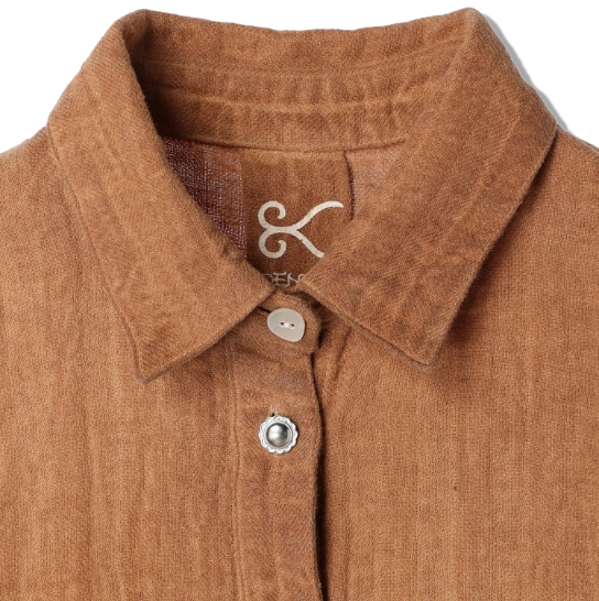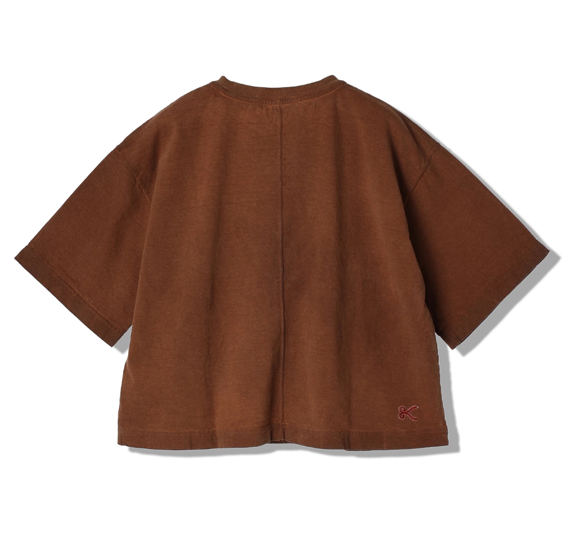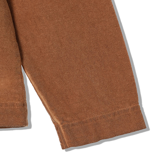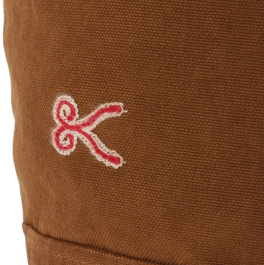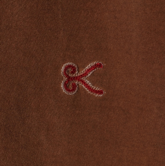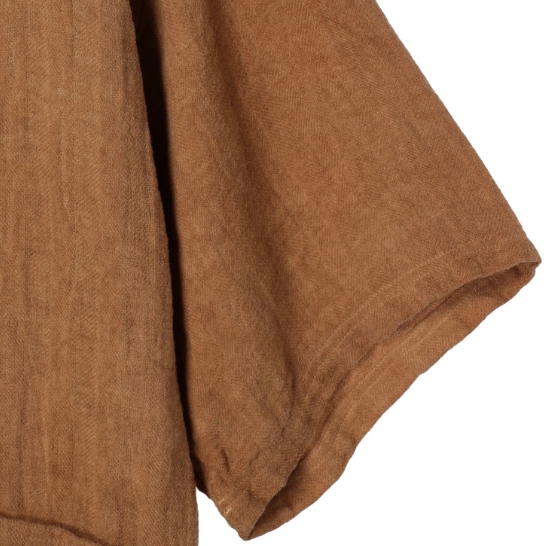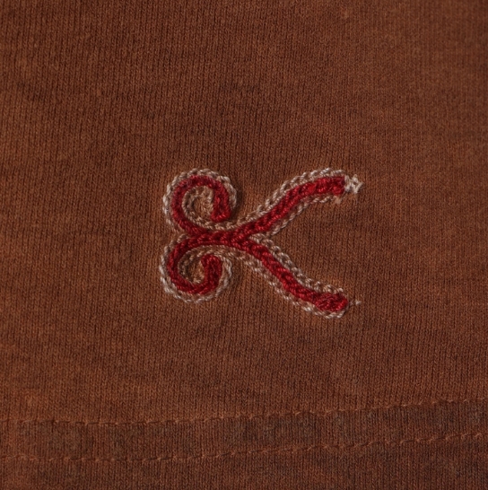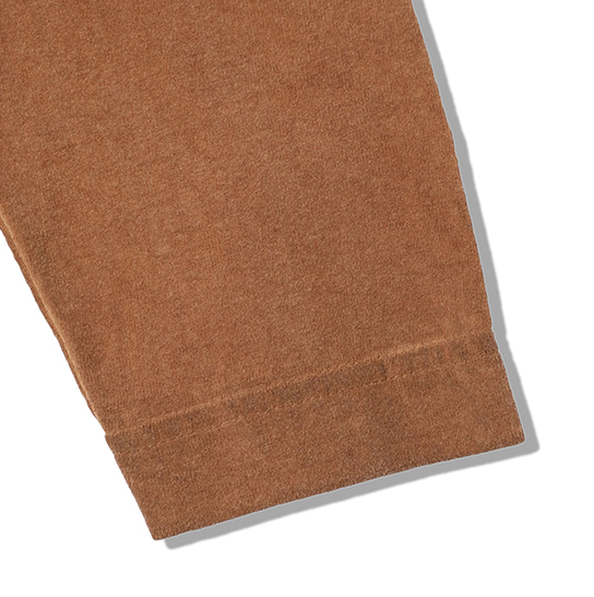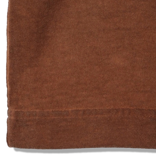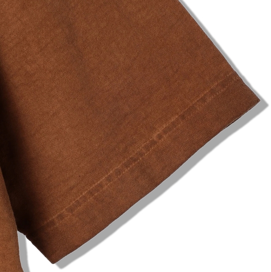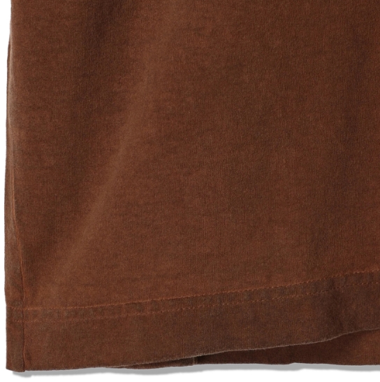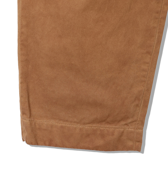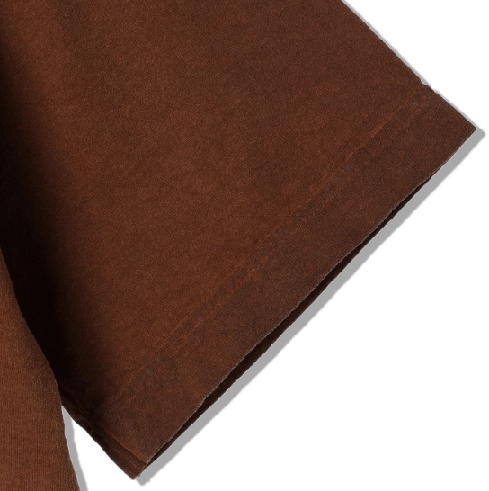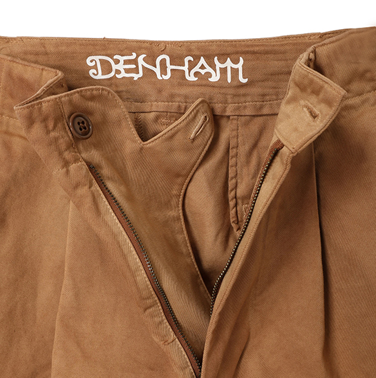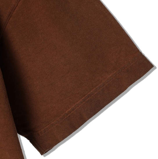 渋柿の未熟な果実を粉砕・圧搾・発酵・熟成させて得られる抽出液である「柿渋」の起源は、日本に伝来した平安時代に遡ります。「柿渋」に含まれる成分のタンニンが繊維や木材などに防水・防腐の効果をもたらすことから、日用道具・衣類・建造物・治療薬などに幅広く重用されてきました。日本では柿渋の茶色が伝統的な色として使われています。柿渋染めはインディゴのように使えば使うほど色が抜けていき変化していきます。DENHAMの柿渋染めは特別な方法で⾏われており、染色後、⼀旦水に最低限湿らせ上で、柿渋を表⾯にとどめてから乾燥させていきます。その工程を2~3回繰り返し、染める回数を重ねていき、色を濃くしていきます。