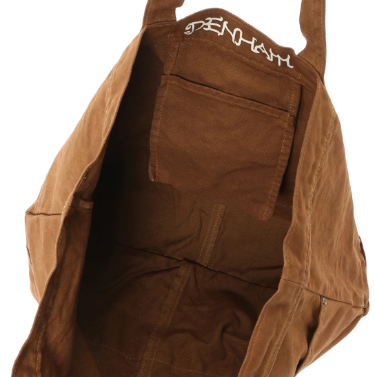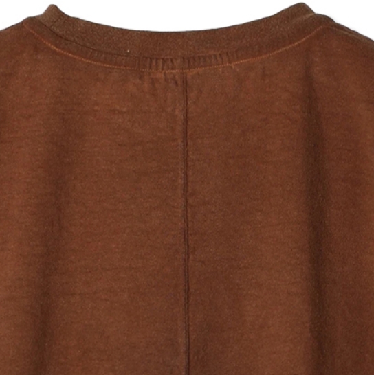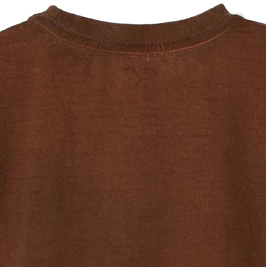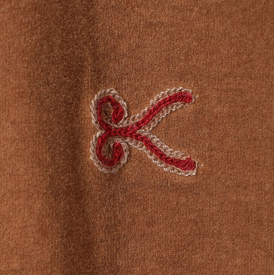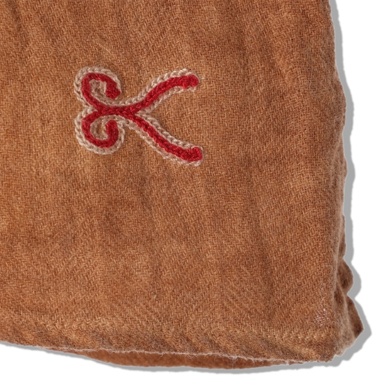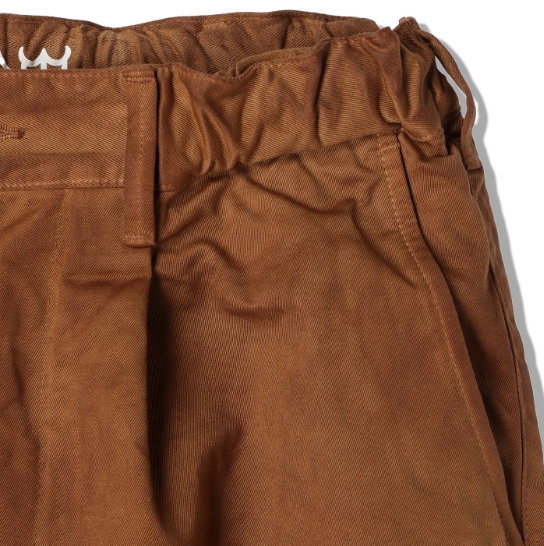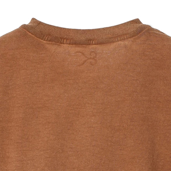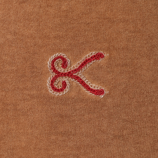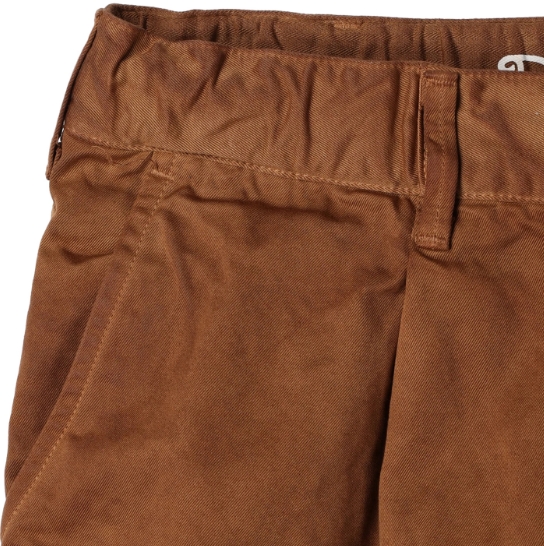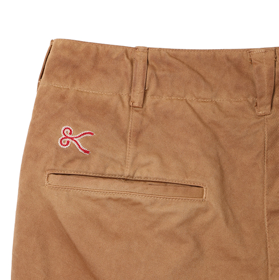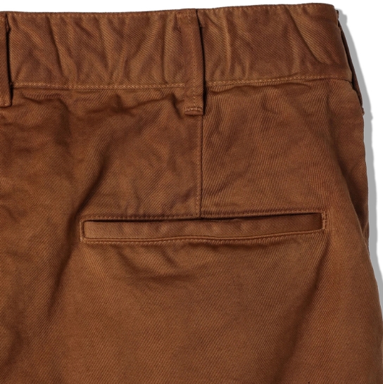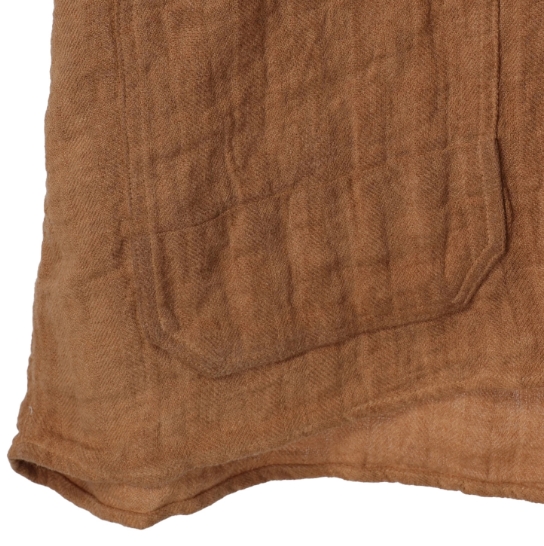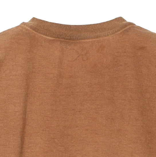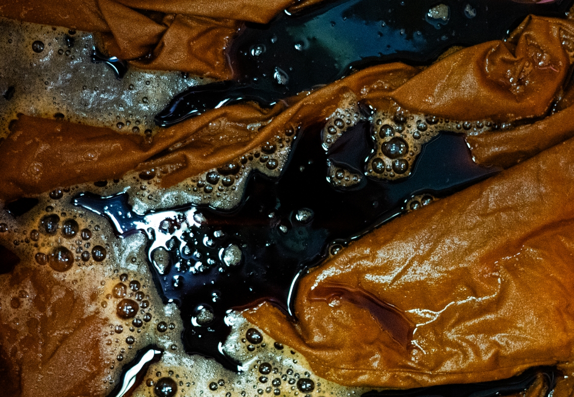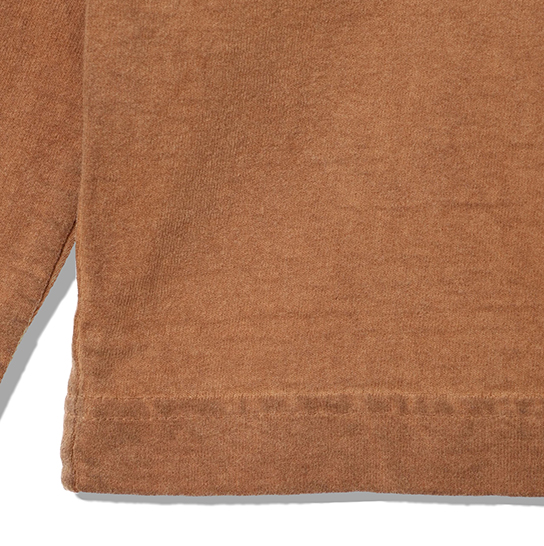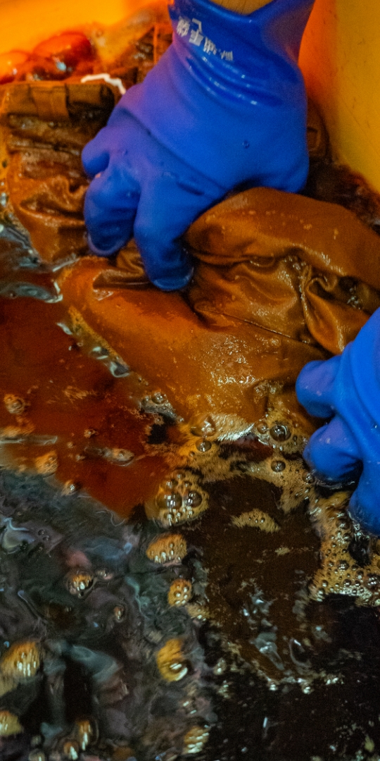 渋柿の未熟な果実を粉砕・圧搾・発酵・熟成させて得られる抽出液である「柿渋」の起源は、日本に伝来した平安時代に遡ります。「柿渋」に含まれる成分のタンニンが繊維や木材などに防水・防腐の効果をもたらすことから、日用道具・衣類・建造物・治療薬などに幅広く重用されてきました。日本では柿渋の茶色が伝統的な色として使われています。柿渋染めはインディゴのように使えば使うほど色が抜けていき変化していきます。DENHAMの柿渋染めは特別な方法で⾏われており、染色後、⼀旦水に最低限湿らせ上で、柿渋を表⾯にとどめてから乾燥させていきます。その工程を2~3回繰り返し、染める回数を重ねていき、色を濃くしていきます。