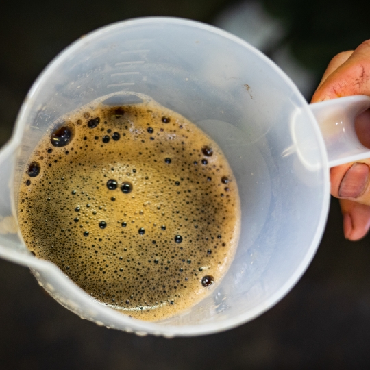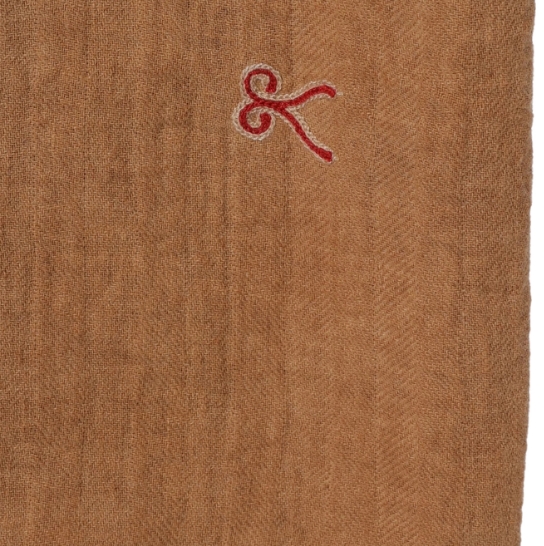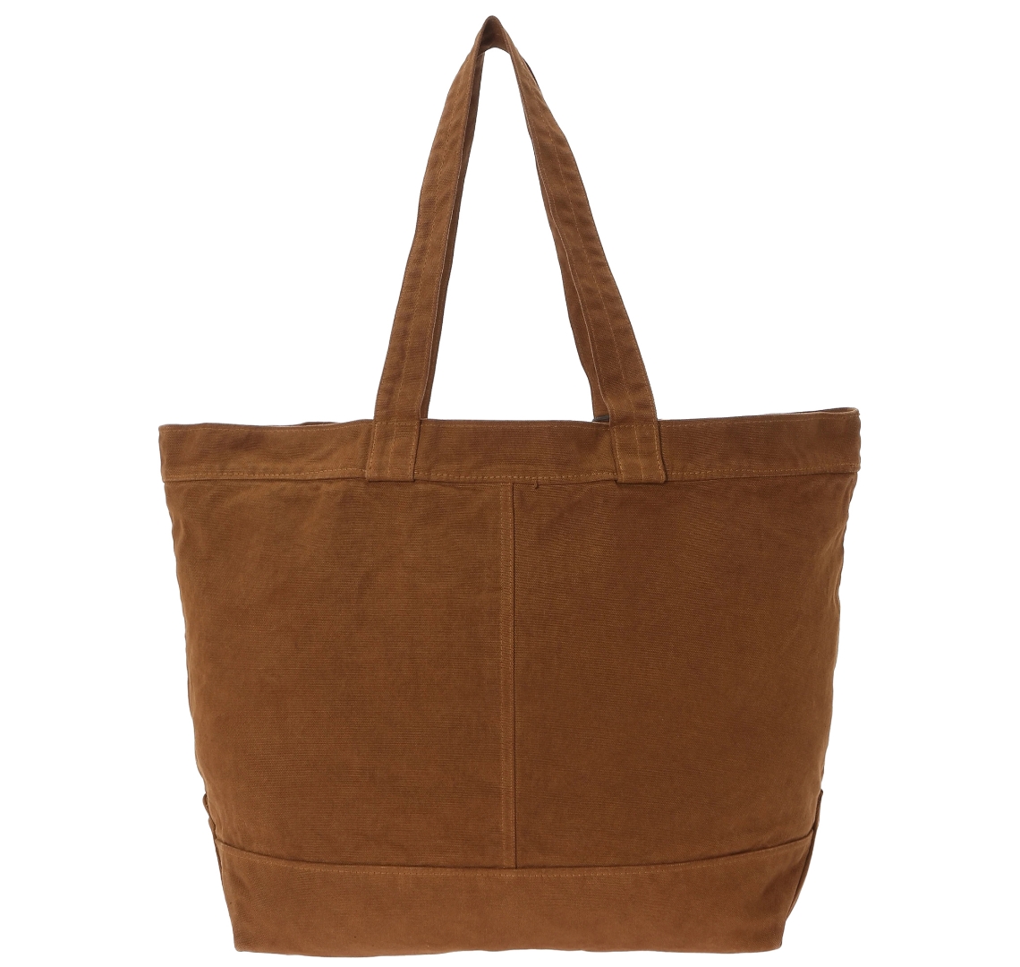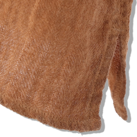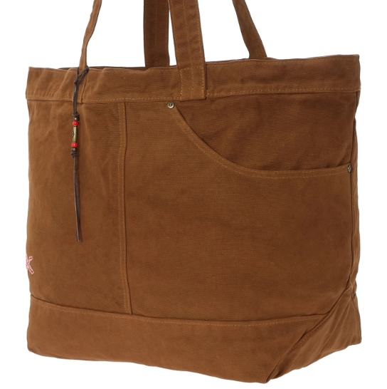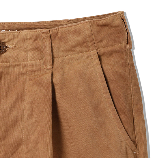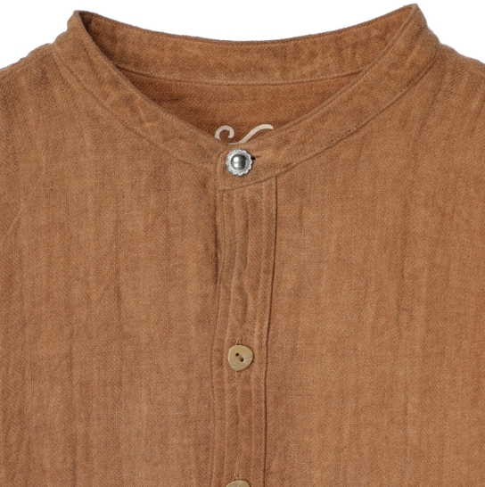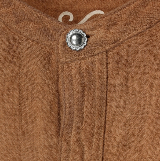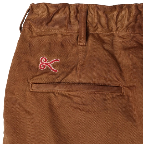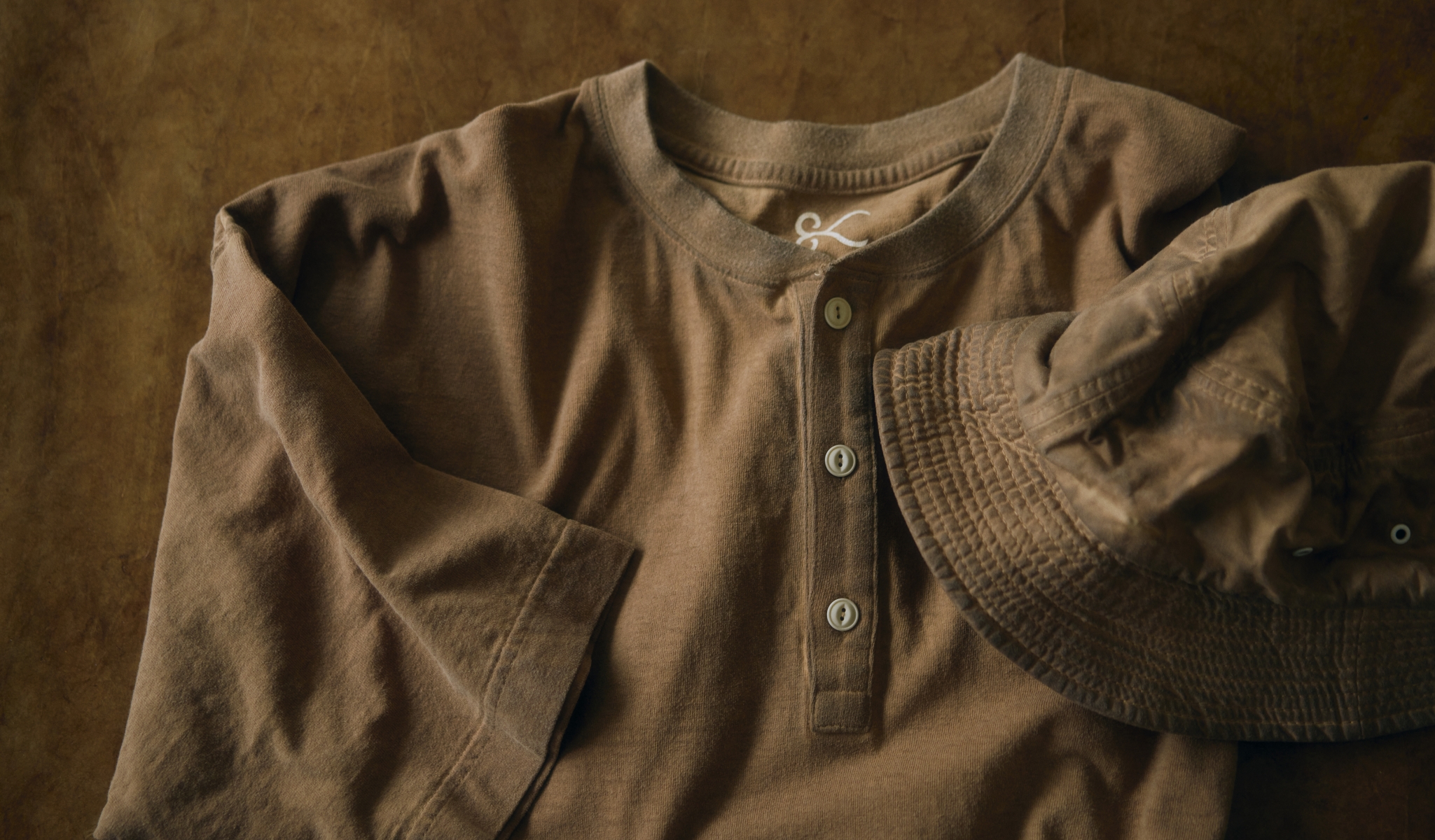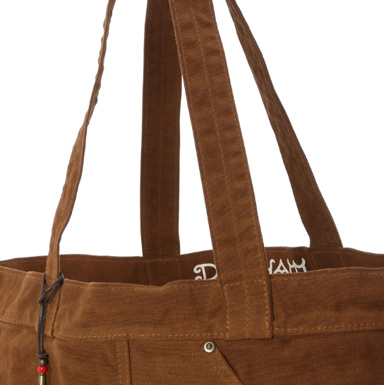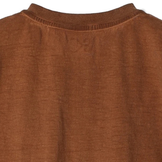 渋柿の未熟な果実を粉砕・圧搾・発酵・熟成させて得られる抽出液である「柿渋」の起源は、日本に伝来した平安時代に遡ります。「柿渋」に含まれる成分のタンニンが繊維や木材などに防水・防腐の効果をもたらすことから、日用道具・衣類・建造物・治療薬などに幅広く重用されてきました。日本では柿渋の茶色が伝統的な色として使われています。柿渋染めはインディゴのように使えば使うほど色が抜けていき変化していきます。DENHAMの柿渋染めは特別な方法で⾏われており、染色後、⼀旦水に最低限湿らせ上で、柿渋を表⾯にとどめてから乾燥させていきます。その工程を2~3回繰り返し、染める回数を重ねていき、色を濃くしていきます。