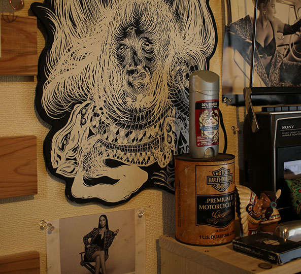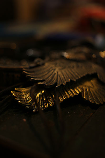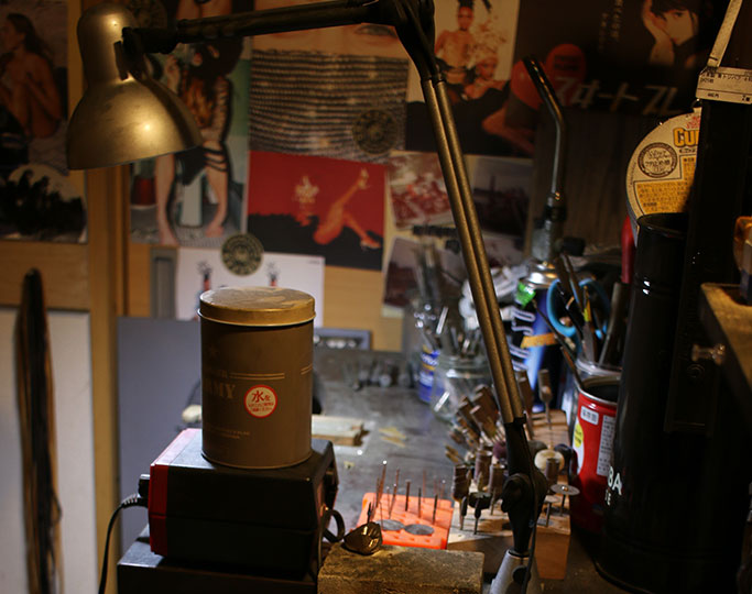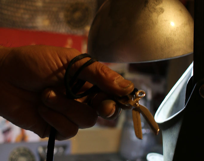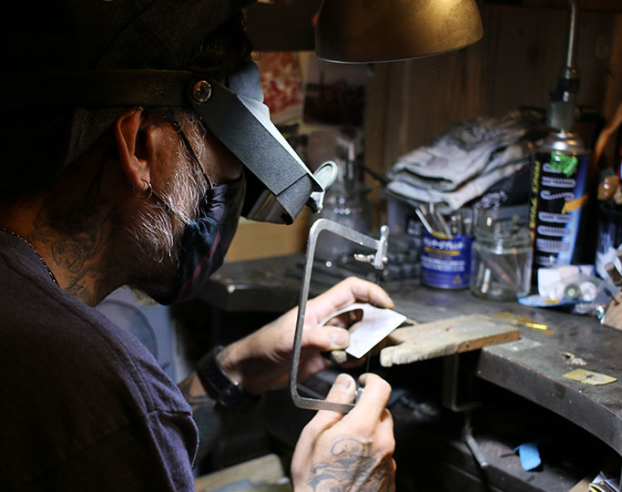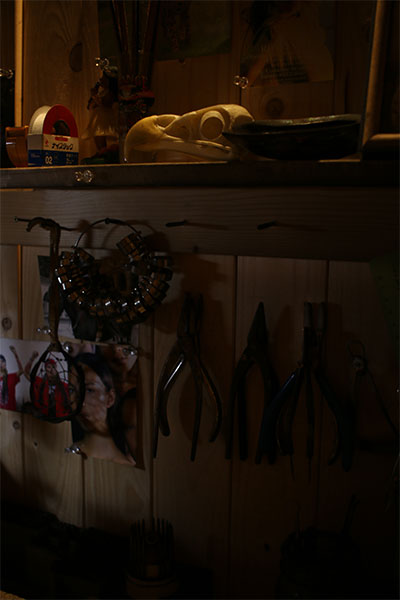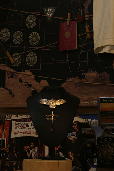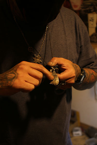「元々オートバイが好きで、整備だったり溶接だったりを覚えるようになって、その頃から漠然と何かを作りたいなと思ってました。その頃小さい洋服屋さんをやっていて、その店の奥で空いた時間にシルバーアクセサリーを作り始めたのがきっかけです。ハーレーに乗ってたんですけど、自分の周りのバイク仲間がインディアンジュエリーを付けてて、自分でも作ってみたいと思ったんですけど、やるからにはちゃんと勉強してから作りたいなと思って、5~6年前にインディアンに会いに行き始めて、っていう流れです。それでインディアンモチーフも作り始めたって感じですね。」