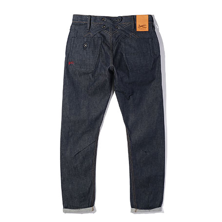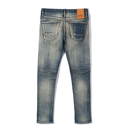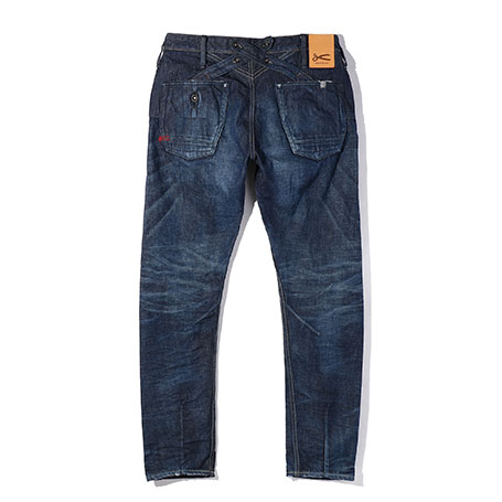 オーセンティックで明るめのインディゴ色に加工した生地を、定番のCROSSBACKに着用後1年のイメージで、ジーンズ全体に立体加工を入れていますが、そのまま経年変化をお楽しみいただけるように加工しております。