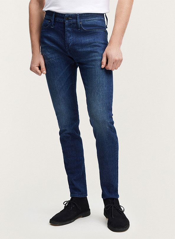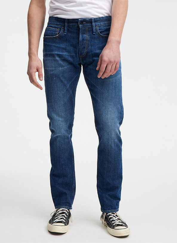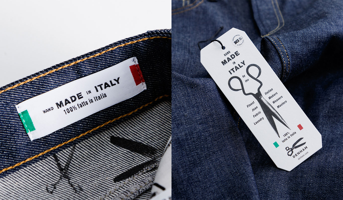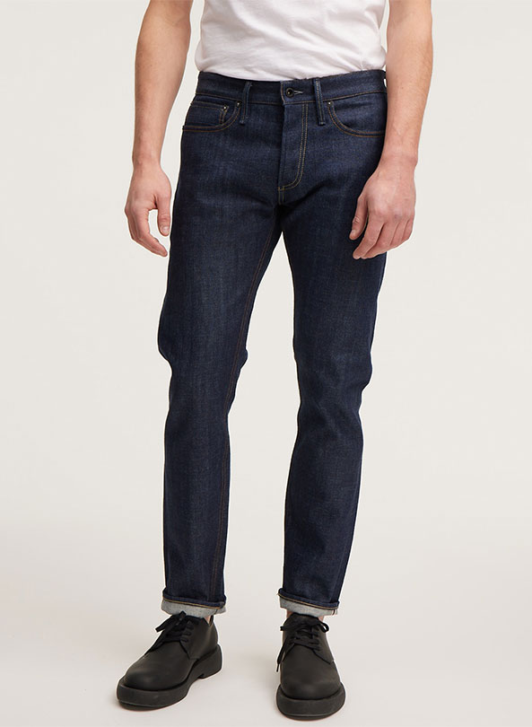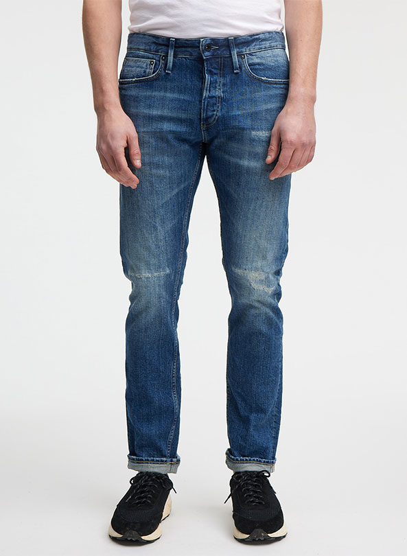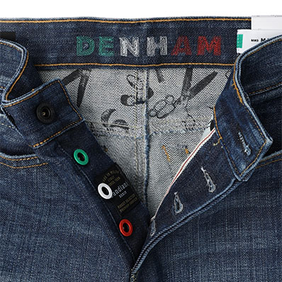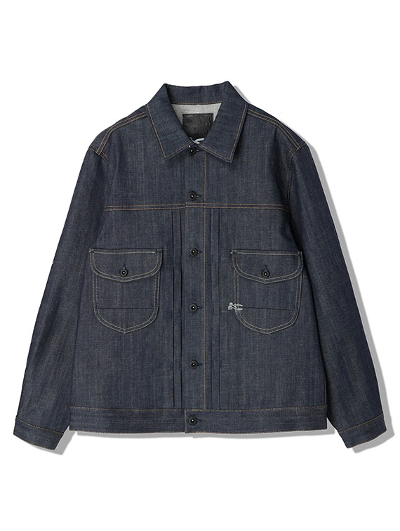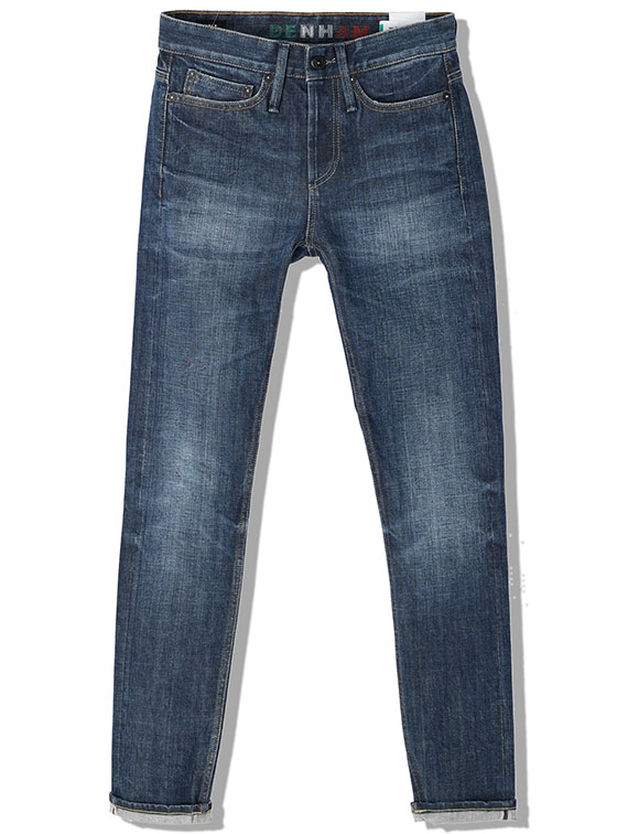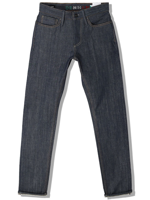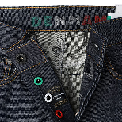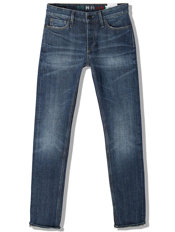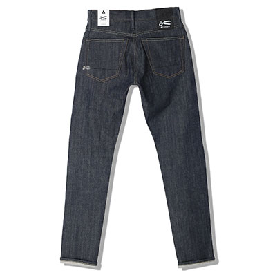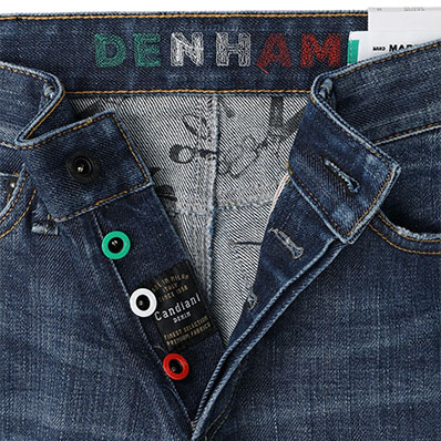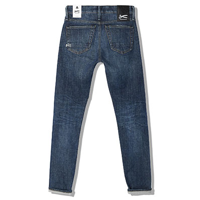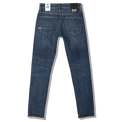 カンディアーニ社の細幅シャトル織機で織られたコンフォートストレッチのバージンセルビッチデニムから裁断し作られています。“DGL”(DENHAM GARMENT LIBRARY)に保管されている 2 年間履きこまれたデニムを忠実に再現しているダークエイジドウォッシュが特徴です。