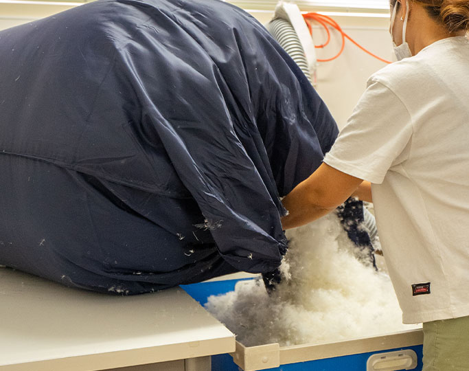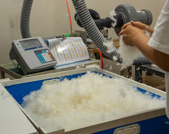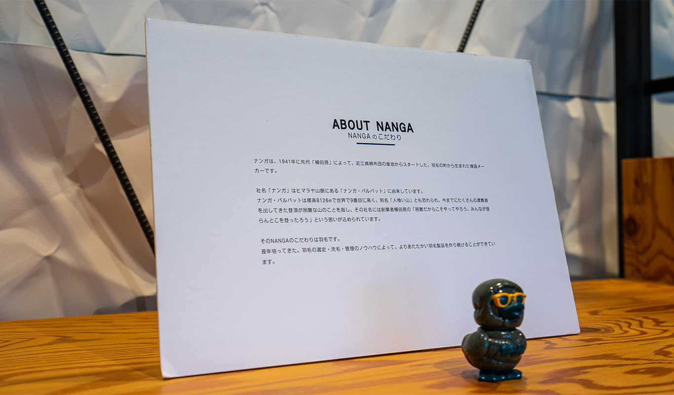 ナンガは、1941年に先代「横田晃」によって、近江真綿布団の産地からスタートした、羽毛の町から生まれた寝袋メーカーです。社名「ナンガ」はヒマラヤ山脈にある「ナンガ・パルバット」に由来しています。ナンガ・パルバットは標高8126mで世界で9番目に高く、別名「人喰い山」とも恐れられ、今までにたくさんの遭難者を出してきた登頂が困難な山のことを指し、その社名には創業者横田晃の「困難だからこそやってやろう、みんなが登らんとこを登ったろうという」という思いが込められています。そのNANGAのこだわりは羽毛です。長年培ってきた、羽毛の選定・洗毛・管理のノウハウによって、よりあたたかい羽毛製品を作り続けることができています。