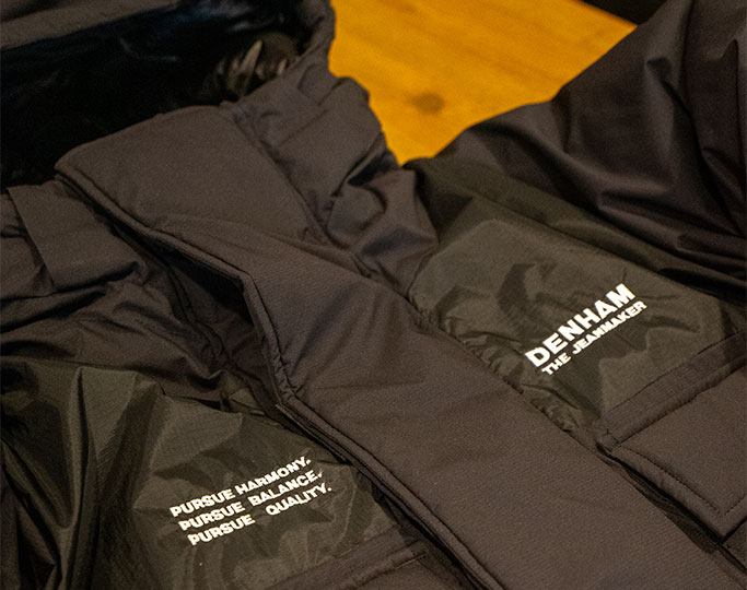 これ斬新だなって思って。こうやって自分達の製品が、ブランドさんと一緒にコラボレーションをやることで、特にデザインから一緒に作るようなDENHAMとの取り組みのような形ってなると、僕たちが気付けない新しい気付きというか、面白さとか、なんかそういうのをやっぱり、いつも刺激受けますね。例えば胸に刺繍でブランドネームを入れてますけど、刺繍って僕たちの概念だと、穴を開けるから、要は水が入ってきちゃうとか、温かい空気が出ていっちゃうとか、基本的にアウトドア寄りの商品だとあまりしないんですけど、でもこうやってみると、すごく雰囲気がいいじゃないですか。なんかこういう気付きというのが、僕にとってはいつもすごくプラスになっているなって思います。