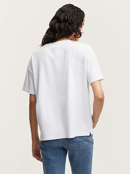 胸元にあしらわれたシザーズマークがさりげないポイントのTシャツ。肩落ちのゆったりとしたシルエットで、ルーズな着こなしを楽しめます。様々なスタイリングで活躍してくれるホワイトのカラーも魅力。1枚で着用するのはもちろん、カーディガンやシャツと合わせたコーディネートもおすすめです。
