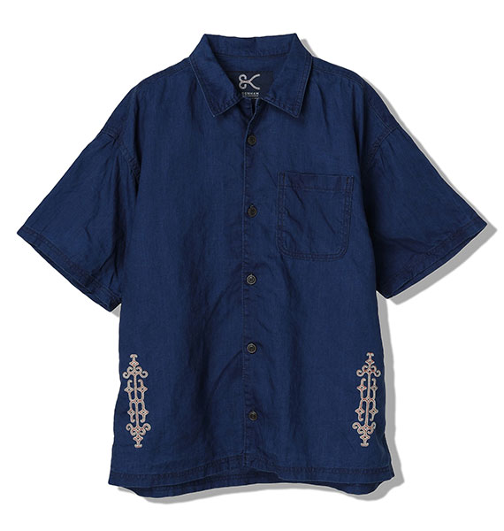 a IN Uのリネンシャツ。フロント部分に刺繍を施したオープンカラーシャツ。ショーツと同素材のためセットアップが可能です。生地の染色は、インディゴ染めで国内の染工場で染色した後染めインディゴ。着用、洗いを繰り返すことで色落ちによるインディゴ染め特有の表情の変化が楽しめます。使用方法、洗い方法、使用期間によりそれぞれ違った変化が期待でき長年使用することにより、独特な味や深みも期待できる素材です。
