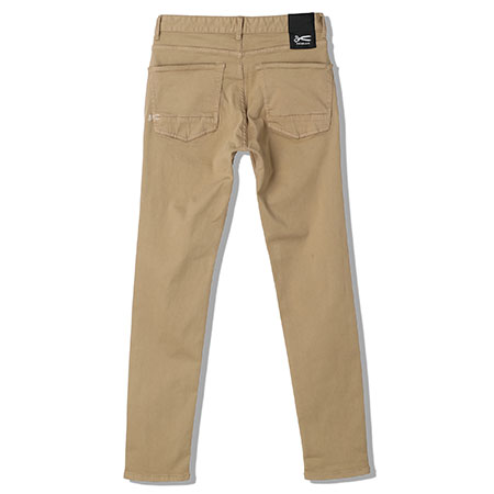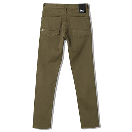 アクティブな動きにもフィットするストレッチチノで仕立てたパンツ。ゆるやかなスリムテーパードシルエットが、すらりとした脚長効果も演出。ブラックのボタンやラベルもさりげないアクセントをプラスします。アースカラーはコーディネートにも取り入れやすく、デイリーユースに活躍してくれるワードローブの頼れる味方です。