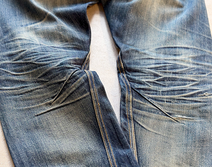 腿の付け根につく「ヒゲ」や、膝裏の「ハチノス」は、実際に穿き込んだ期間のみが生みだす経年変化となります。