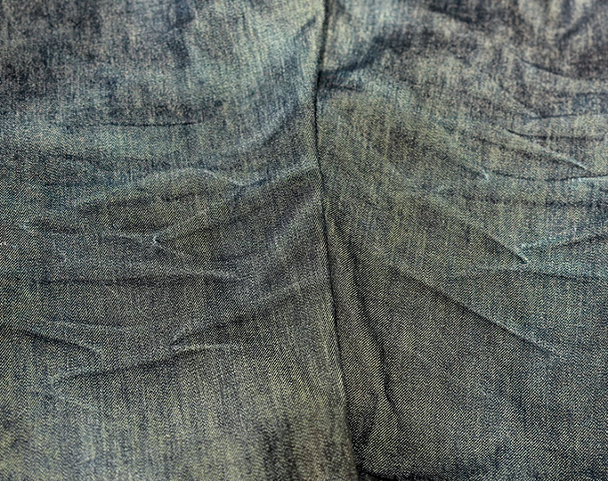 「糊がついたデニム」というのは硬くハリがあり、着用時のシワが折り紙のようにハッキリとした折り跡となり、メリハリのある色落ちやアタリにさせることができます。