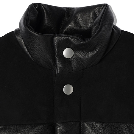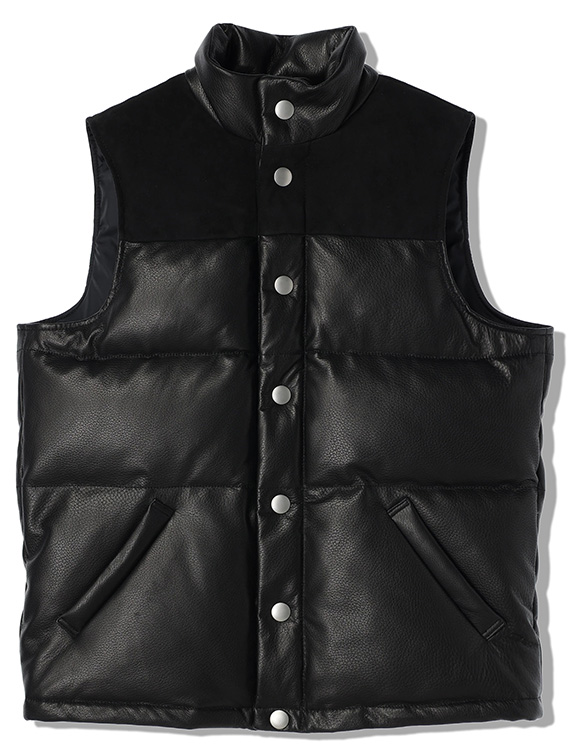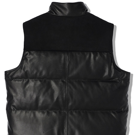 シボ感のある上質な山羊革が落ち着いた風合いを演出するベスト。保温性に優れたホワイトのダックダウンを含んでおり、暖かさを守ってくれます。滑らかなタッチのヨーク部分の切り替えがポイント。カジュアルやきれいめなコーディネートにも取り入れやすいアイテムです。