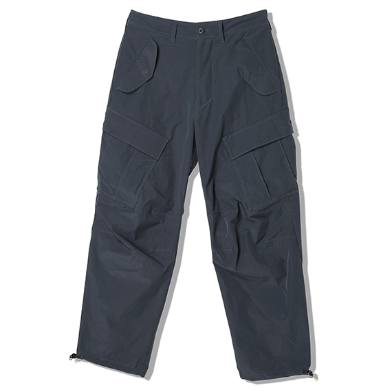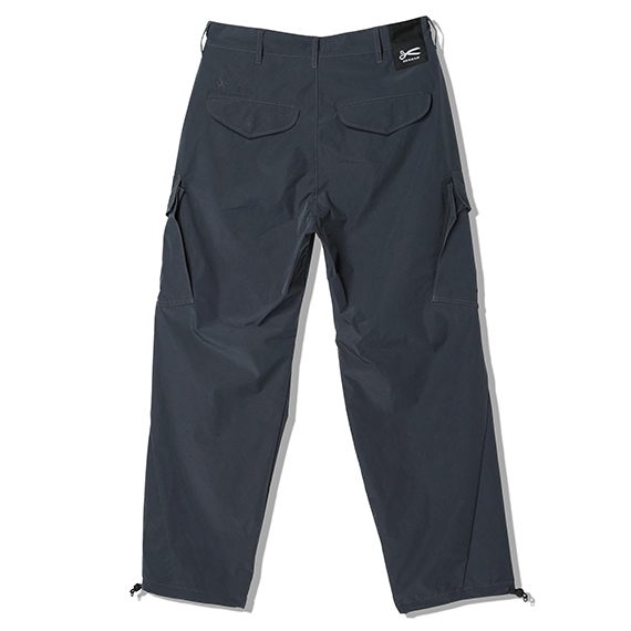 M-65を再構築して作ったソルテックス素材のカーゴパンツ。サイドのフラップポケットがワークウェアライクな印象を与えます。カーゴのポケットを斜めにし、カッティングダーツやラインも新しく表現。裾にはドローストリングを施しているので、シルエットの変化も楽しめます。バックにあしらわれたブランドロゴ入りのパッチもポイント。アウトドアシーンはもちろん、デイリーユースにもお使いいただけるアイテムです。