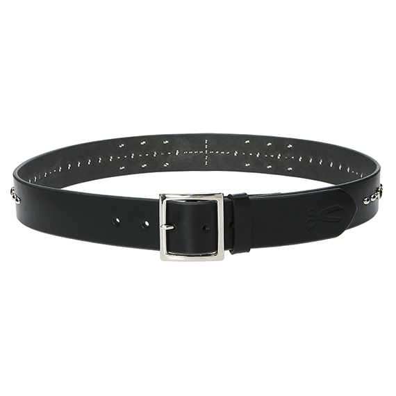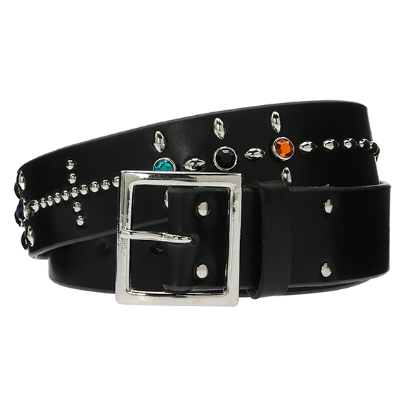 カラーストーンとメタルスタッズがアクセントになったベルト。長く愛用するほどに風合いの増す牛革素材を使用。バックルはスクエアでシンプルに仕上げました。目を引く存在感のあるデザインで、コーディネートのポイント使いにも映えるアイテムです。