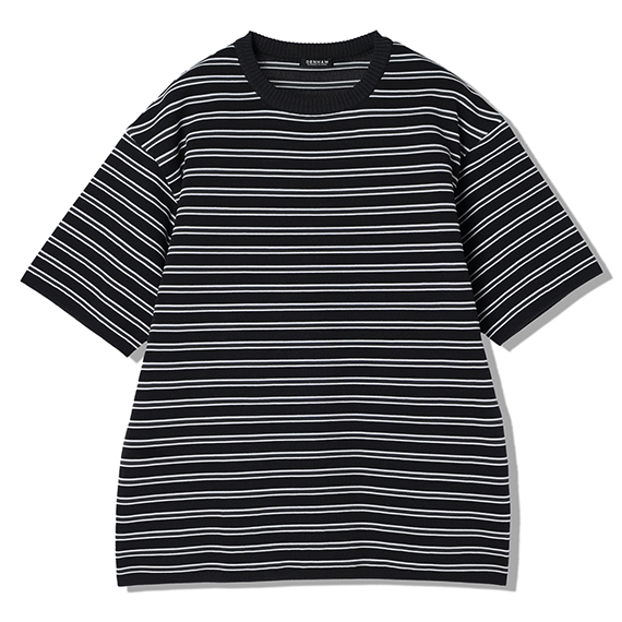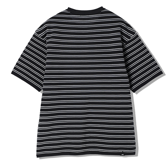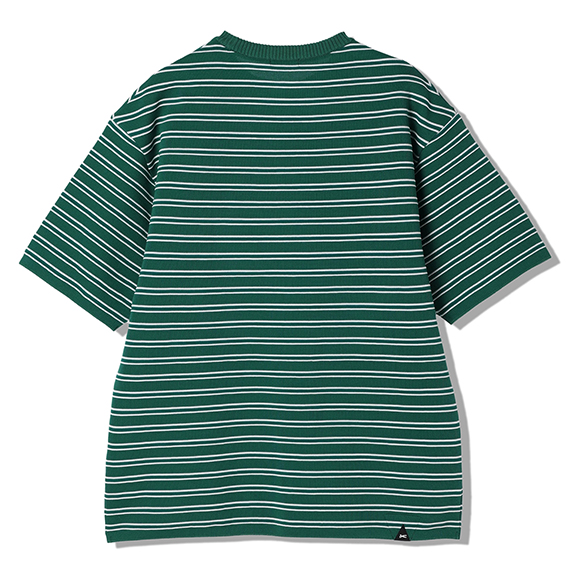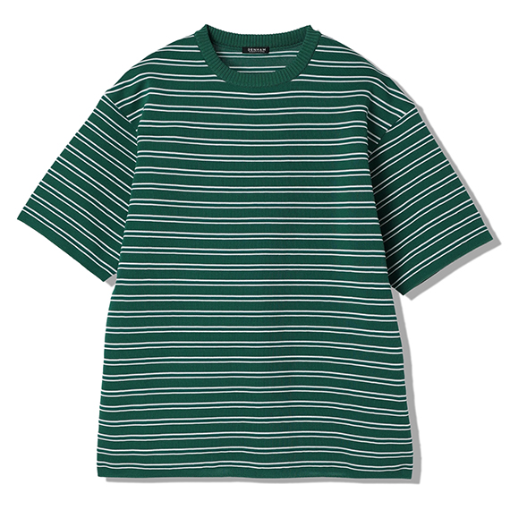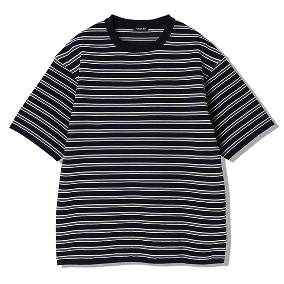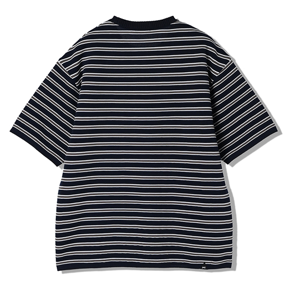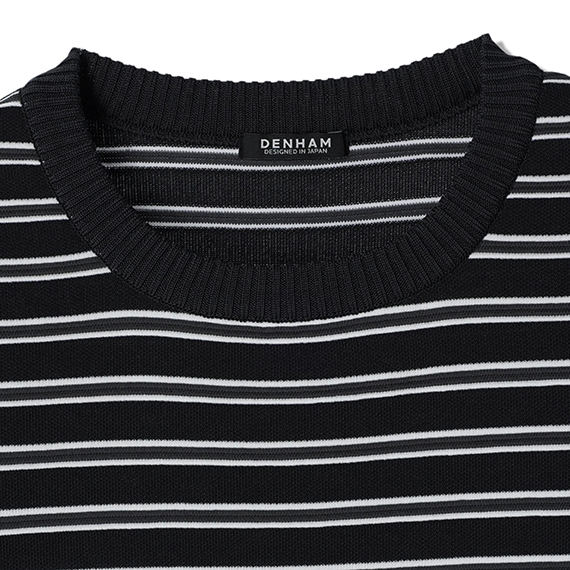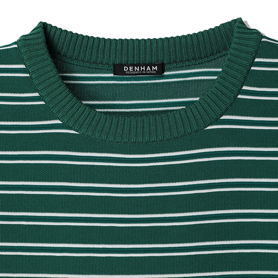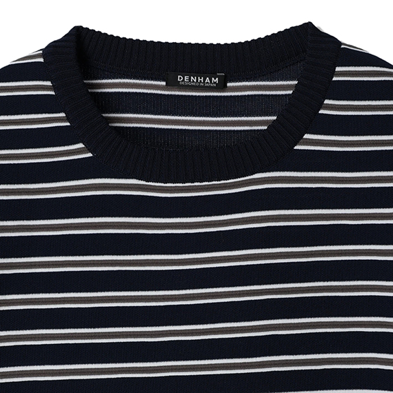 吸水性と速乾性に加え、洗濯に強く、形状安定性にも優れている為、乾燥機を使用しても崩れず、ハンガー干しをしても伸びないというハイブリットな逸品。ニットならではの発色性と心地よい風合い、そしてカットソーでは表現できないランダムな柄やピッチ、色合いを表現。また、表面に凹凸感を入れ、他にはないDENHAMオリジナルボーダーで制作した唯一無二のアイテムです。