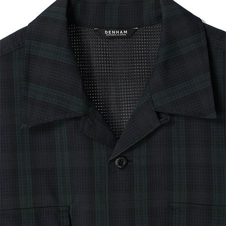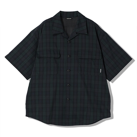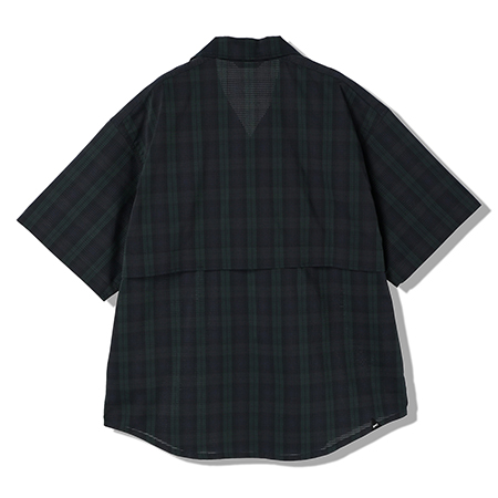 テック素材を使用したオープンカラーのチェックシャツ。フラップポケットにピスネーム、背⾯にはメッシュのベンチレーションを搭載。通気性も良く軽やかな着心地を実現しました。吸水速乾加工を施し、さらりと快適な着用感も魅力のひとつ。暑くなる季節にも重宝するアイテムです。