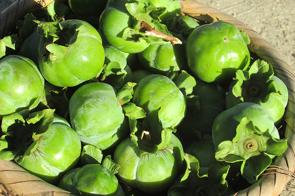 柿渋染めは、未熟な青い渋柿から抽出される天然の染料を使った染色方法です。柿渋には多くのタンニンが含まれており、染色に重要な役割を果たしています。タンニンは防腐・抗菌作用を持ち、染色された布を長持ちさせる効果があります。柿渋に含まれる酪酸という成分は防腐剤や防水剤としての効果に寄与します。