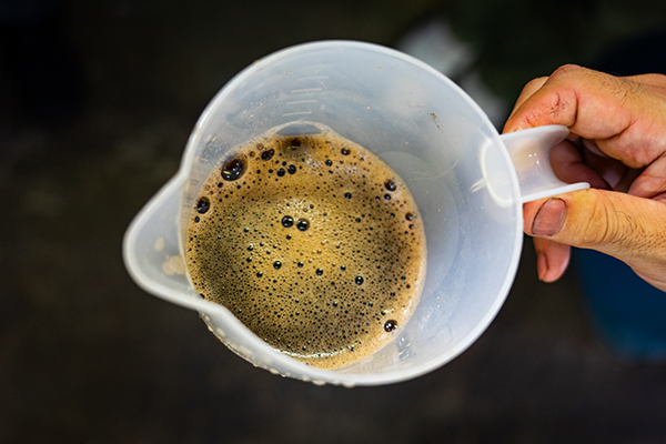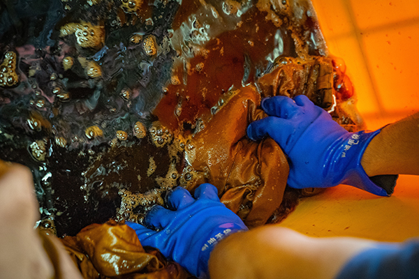 浸透膜の加工により、純度の高い匂いのない柿渋を抽出。酪酸を含む度合いによっても、染色時の風合い、深みが変わります。