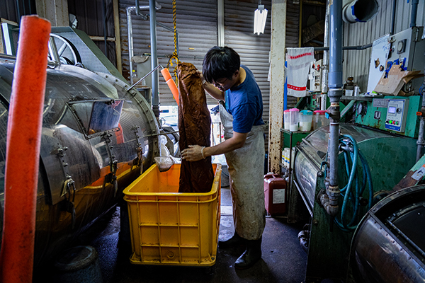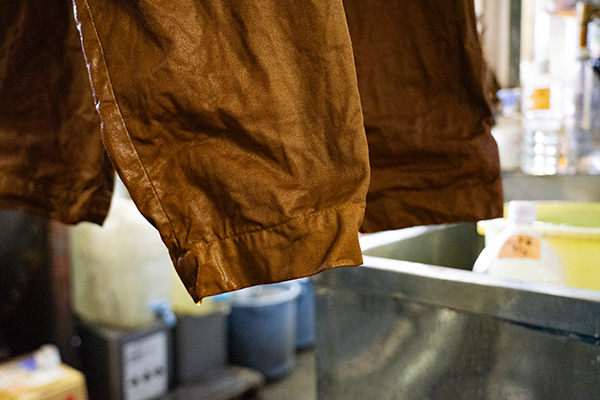 染色時には柿渋を適度に薄めることでムラを防ぎ、生地自体も湿らせてから柿渋につけ職人の手作業でもみ込んでいきます。すると、色素が生地の表面に均一に付着しやすくなり、柿渋を表面にとどめた状態で乾燥させ、その工程を繰り返し「重ね染め」という方法で色を濃くしています。