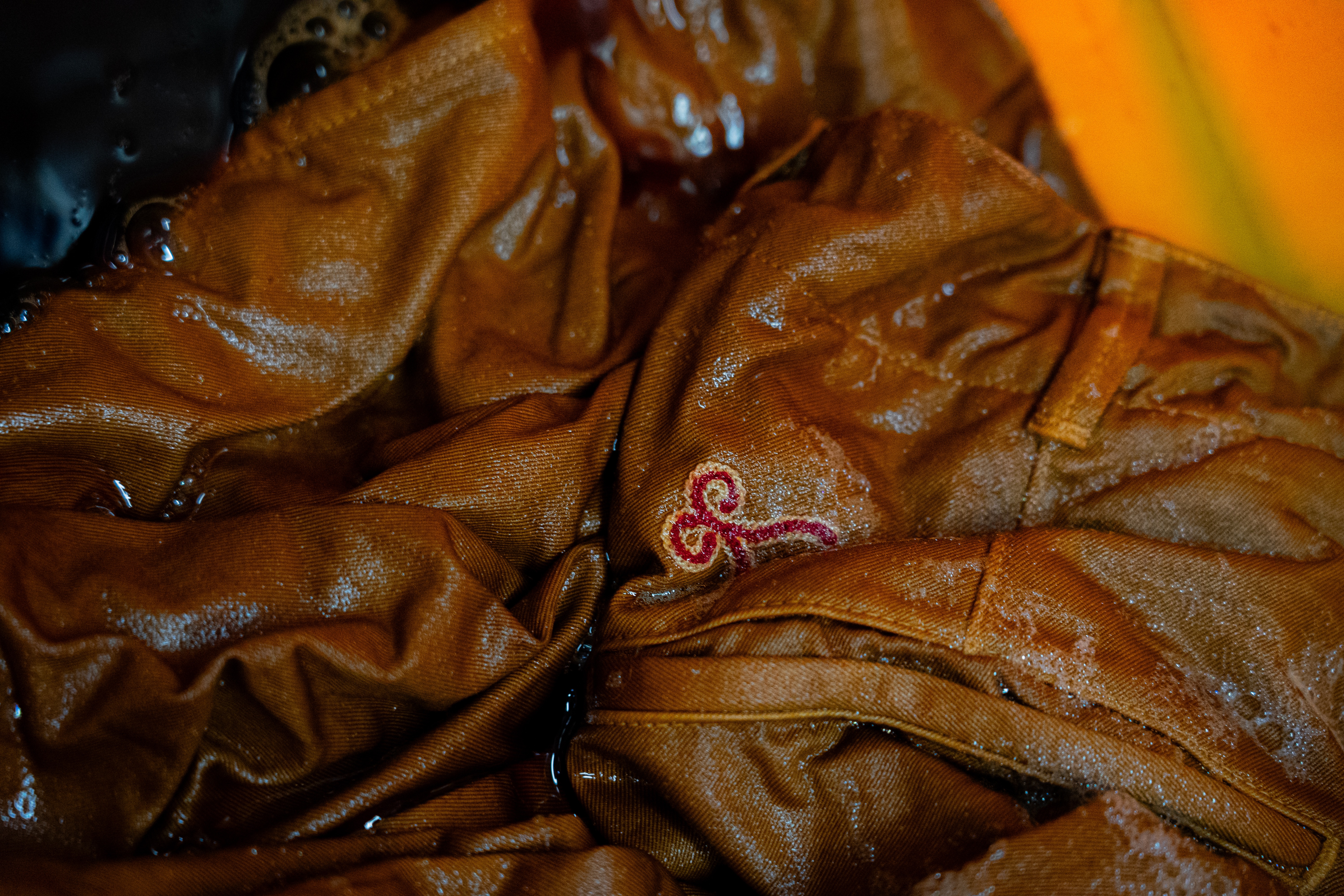 今回デンハムのアイテムに落とし込んだ柿渋は匂わない、酪酸を取り除いた、純度の高い柿渋を使用し制作しています。