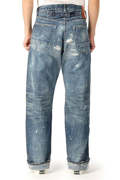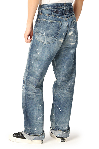 ユーズド感あふれるヴィンテージライクなデニムパンツ。長く履き古したようなダメージやリメイク風のディテールやポイント。クラシカルなボタンフライ。バックベルトもポイントです。脚を長く見せてくれるハイウエストデザイン。こなれ感のある大人のカジュアルスタイルを楽しむことができる逸品です。