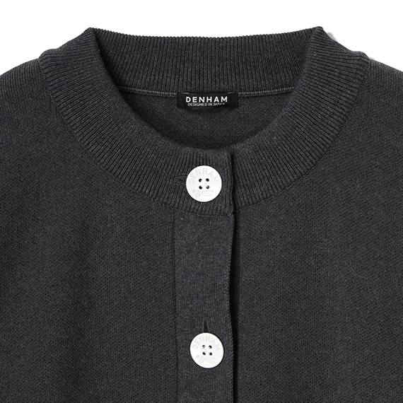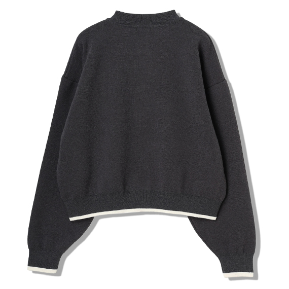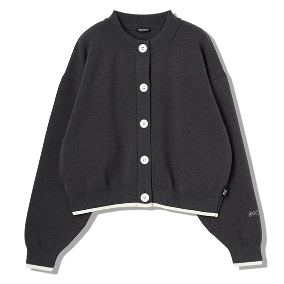 裾や袖口の配色ラインが表情感を演出するニットカーディガン。ネックラインに沿うような首元が心地よいフィット感を実現します。フロントボタンや袖に描かれたシザーズマークがポイント。ダークグレーの色合いが落ち着いた印象を与えるアイテムです。
