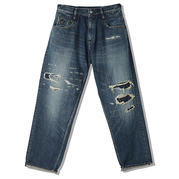 大胆なダメージ加工とステッチが施された個性派デニムパンツ。ゆったりとしたワイドシルエットになっており、動きやすい穿き心地を実現します。コインポケットのディテールやバックポケットのステッチデザインもアクセントをプラス。スタイリングに取り入れるだけで、独特な風合いを楽しめる1着です。