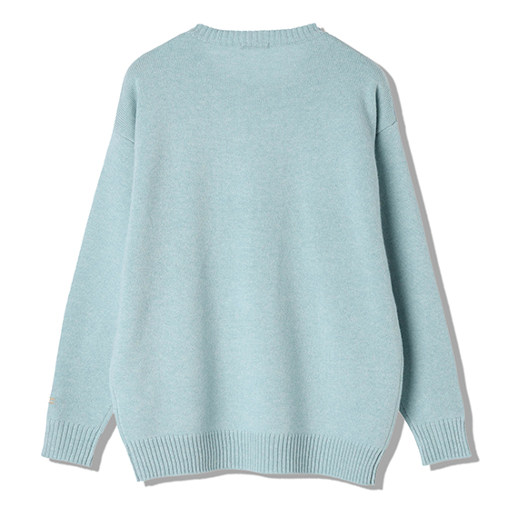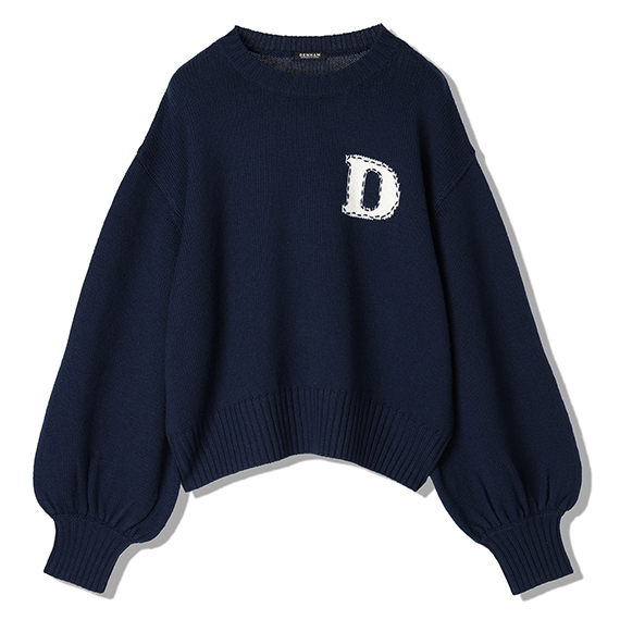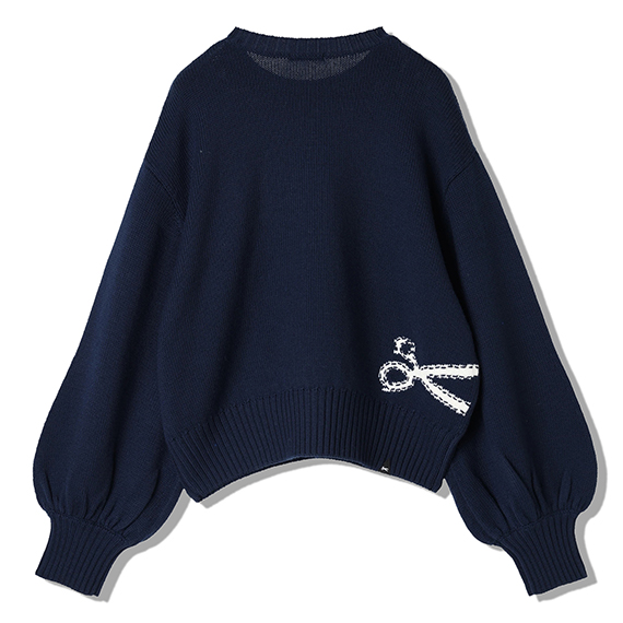 ステッチを施したイニシャルとシザーモチーフがポイントになったクルーネックニット。ぽわんとしたボリュームのあるスリーブも愛らしい表情を演出してくれます。柔らかくなめらかでふわふわとした肌触りのRELAX糸を使用。ウールのナチュラルな風合いも魅力的なポイントです。ピーリングが発生しにくいのも嬉しい。丸みを帯びたシルエットと短めの着丈で女性らしい印象に仕上げた1着です。