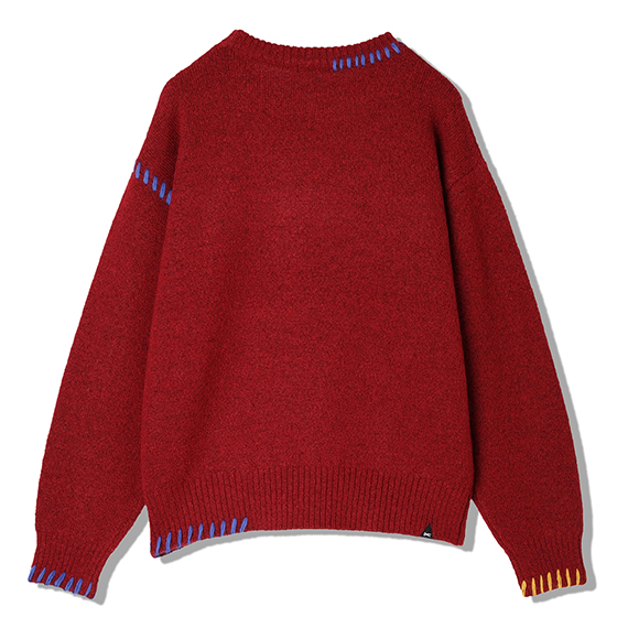 ポップなカラー使いとロングフロンジが目を引くニット。ウールが入った触り心地の良い編地を使用しています。ぬくもりを感じさせてくれるハンドステッチの縁取りもアクセントをプラス。個性派なルックスでコーディネートの主役にもなる存在感のある1着です。