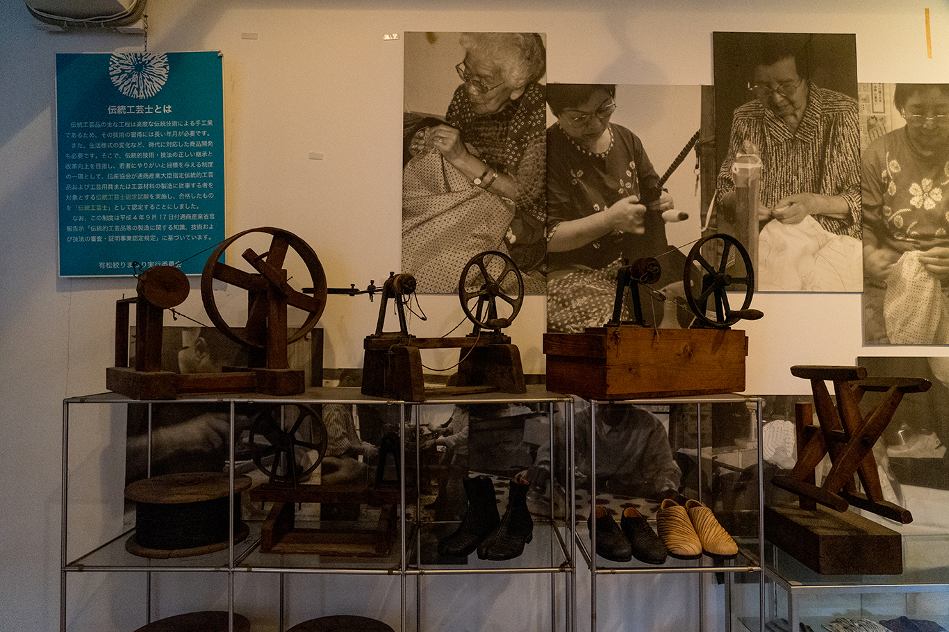(写真)久野染工場にて展示されている伝統工芸士の写真と、絞り機開発の歴史