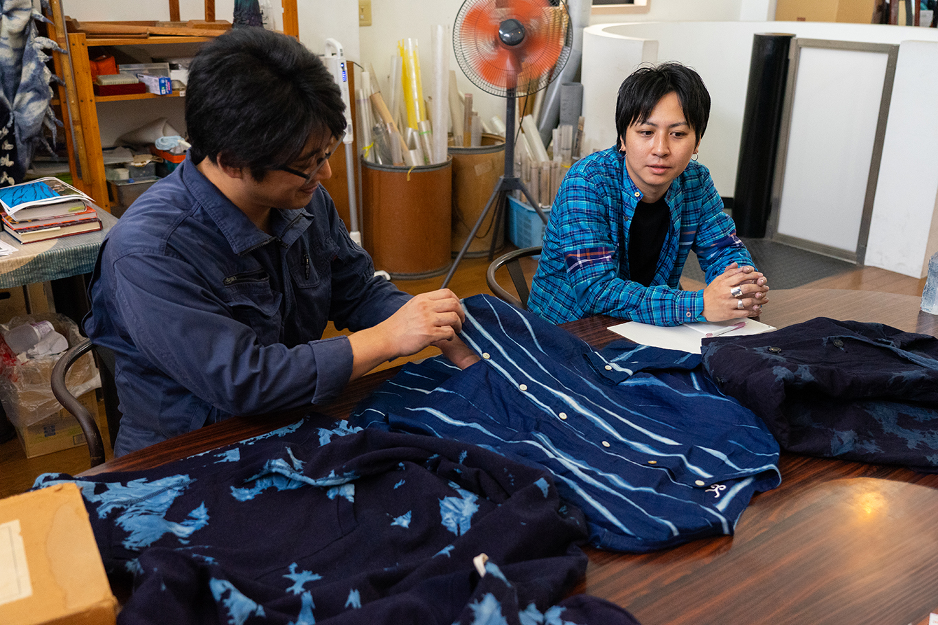 色素を抜く、模様が出来上がる工程。職人技により商品に合わせた抜染方法を選び、製作いただきました。