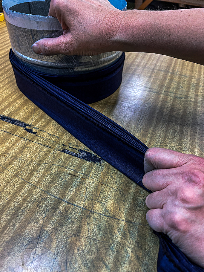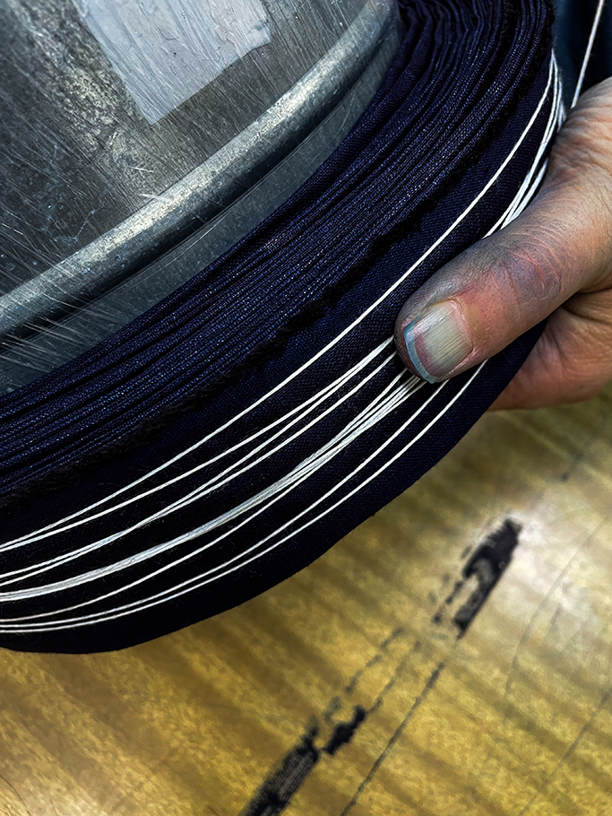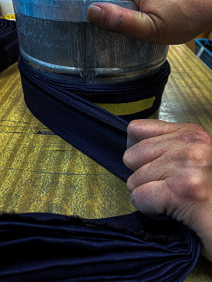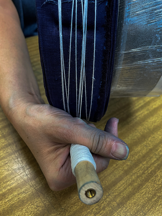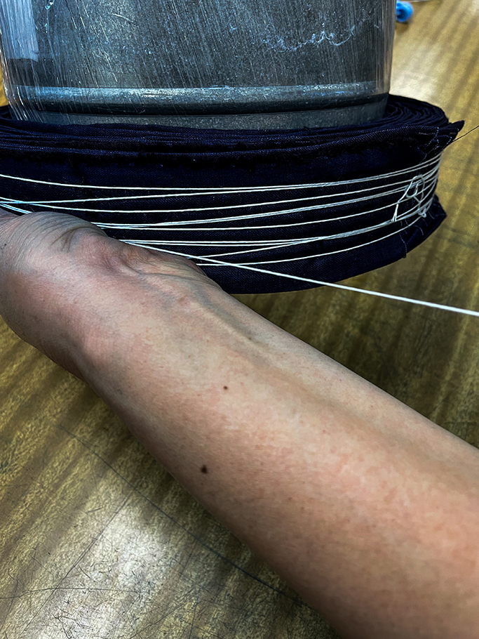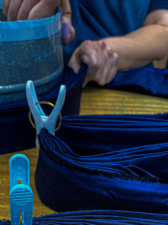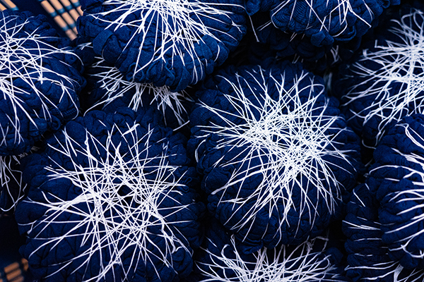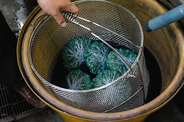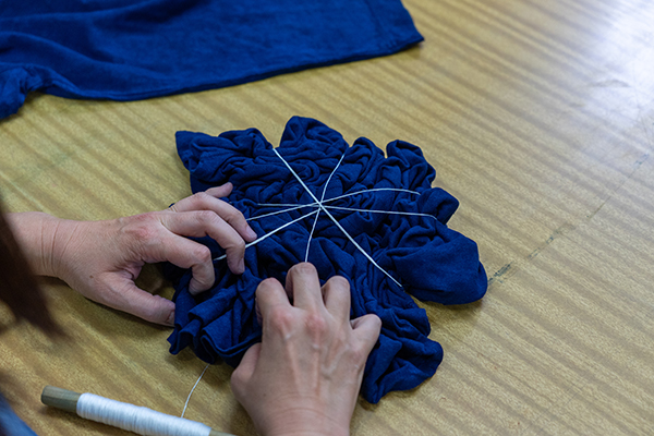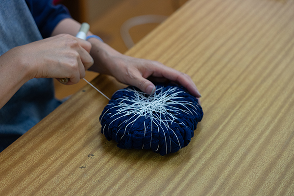 絞りの工程です。きつく固く職人の長年の感覚によって糸で絞る工程です。糸で絞られた部分が濃いインディゴとして色を残します。