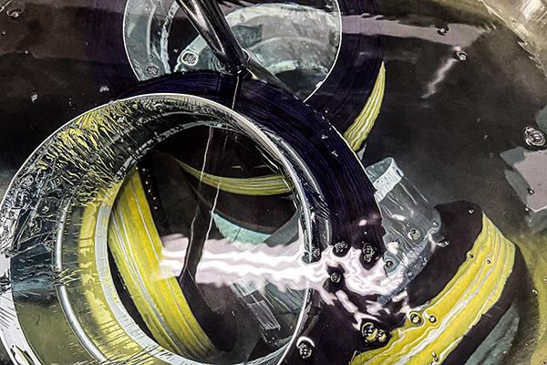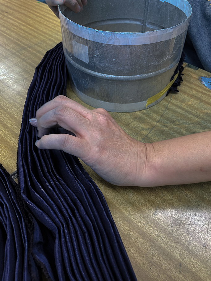 1990年代に開発された絞りで、ぐしゅぐしゅっとしたシワがアパレルの商品に落とし込んだ時に綺麗で、最初は形状記憶加工で多く使われる絞りでした。当時クラッシュ絞りを染色加工で使うことがなく、絞った際の形状上、生地全体を染めることができないでいました。そこから開発研究を重ね、成形した際に楕円型にまとめることで完成したのがクラッシュ絞りとなります。