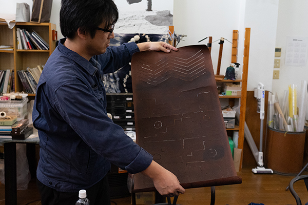 伝統的な和紙に柿渋を塗り込んだ、絞りのデザインを記す型。現在ではプラスチックを用いて作られています。