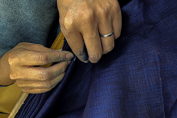 研究を始めたきっかけは、元々浴衣を絞ることが多かった絞りの技法のため、アパレル企業から依頼をされる、絞りを施す生地の「幅」が大きく違ったことがきっかけとなります。絞りを施す浴衣の生地幅はだいたい37cm〜40cmほどとなり、アパレルからの生地幅110cm〜120cm幅となるそう。幅の違いにより、手作業や機械で可能な方法を研究し、たどり着いたのが今回の鳴門絞り。また、絞りを施す生地によっても柄のニュアンスが変わります。
