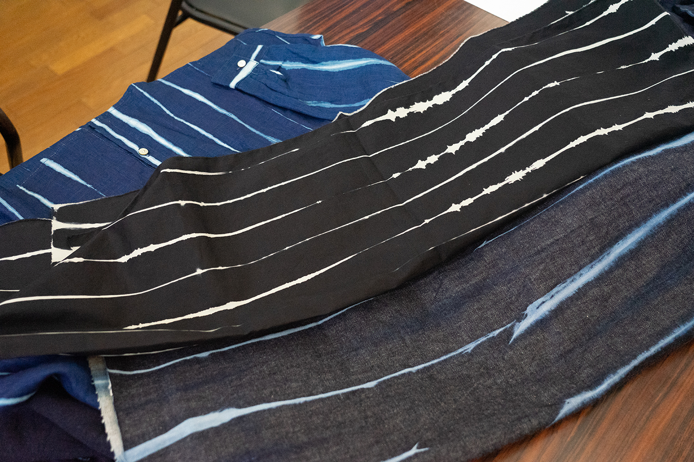 鳴門絞りを他の生地に施した試作サンプル。生地によって全く違った雰囲気に仕上がります。