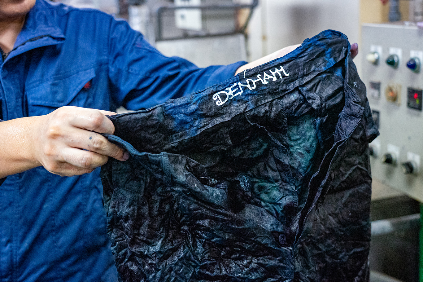 そんな有松で製作された今回のa IN U COLLECTION-ARIMATSU-は、デンハムを象徴する「デニム」からインスピレーションを受けデザインに落とし込まれています。イメージ実現のため、今回のプロダクトのためにオリジナル生地を製作。そしてインディゴでの染色、その生地に有松絞りをし、抜染加工を施す工程で製作しています。