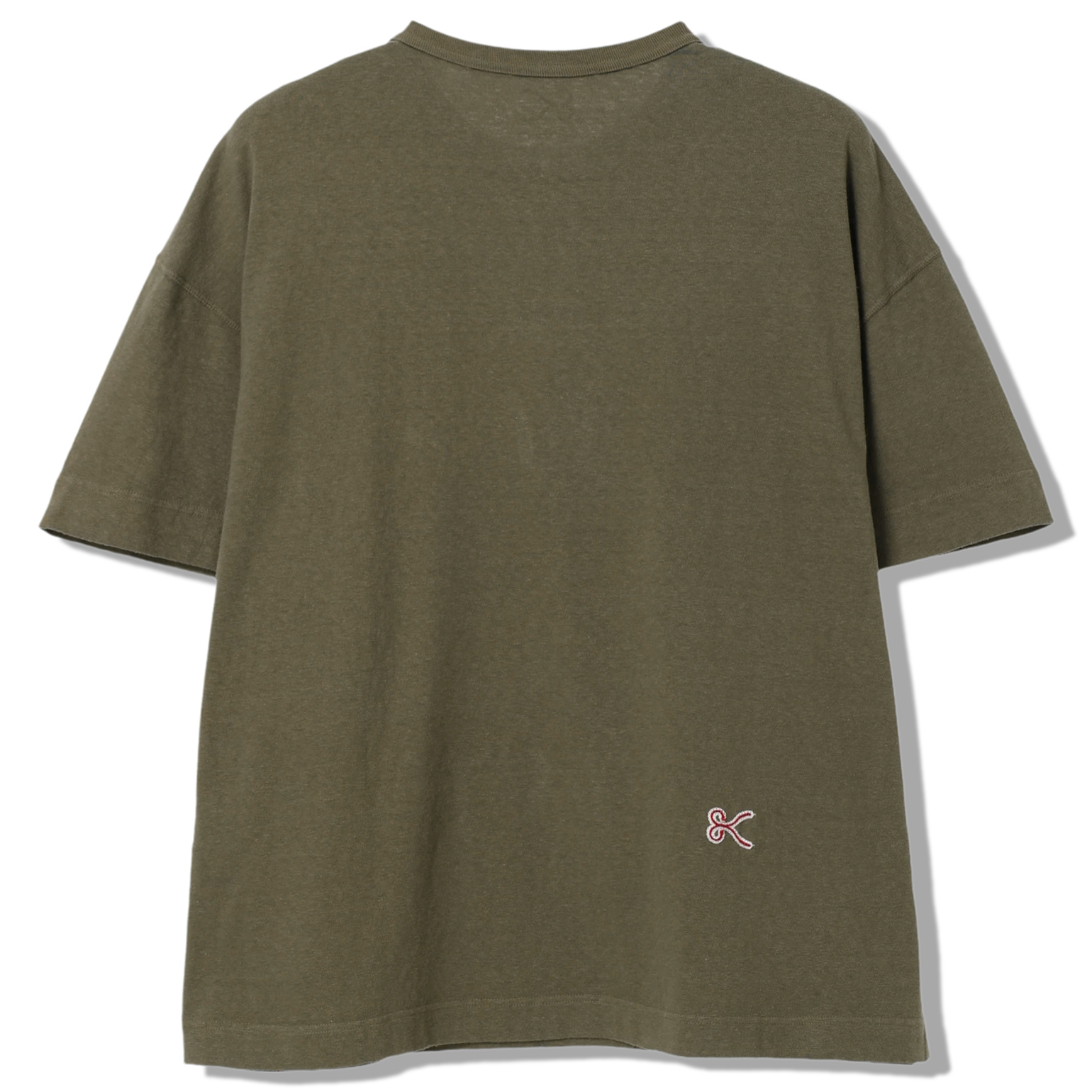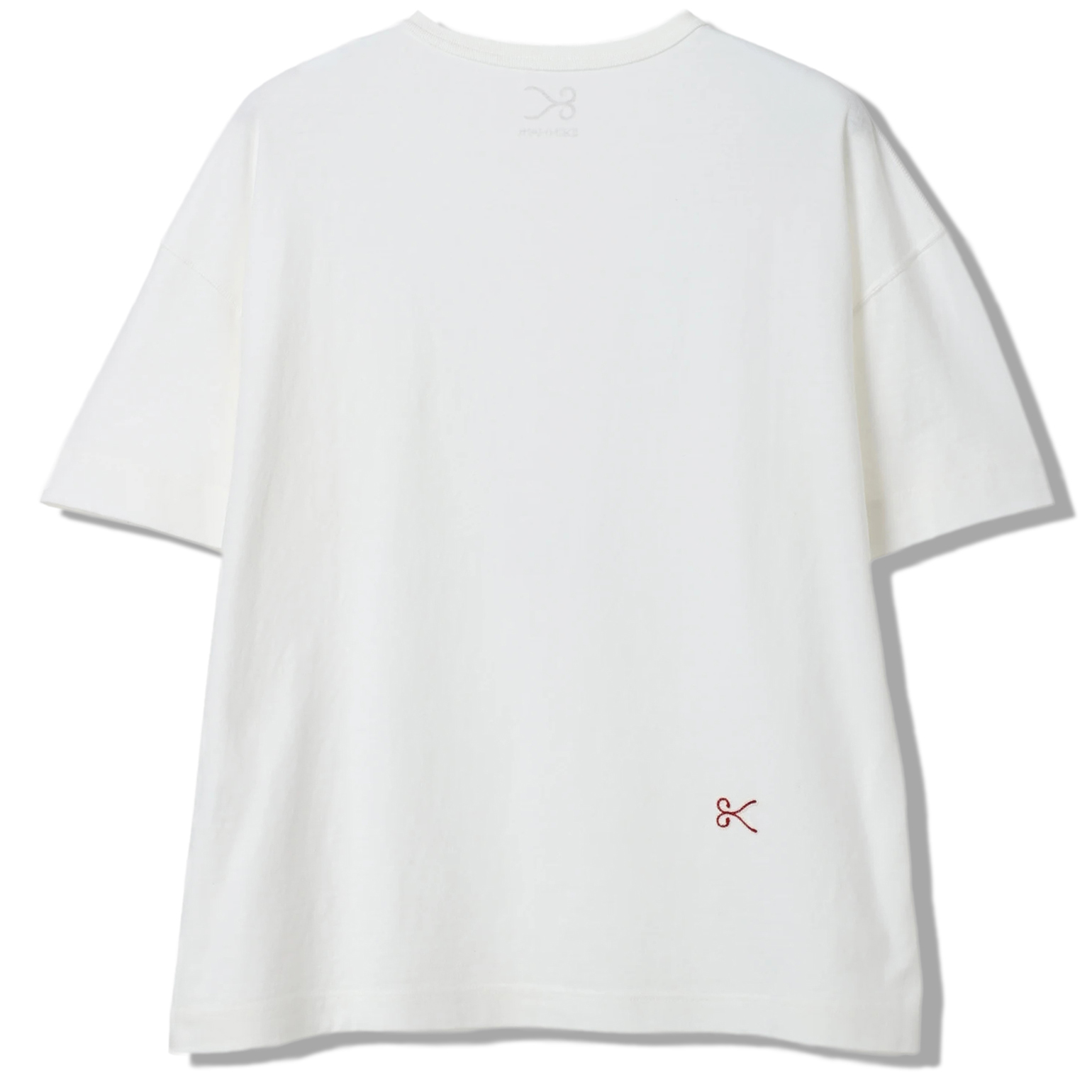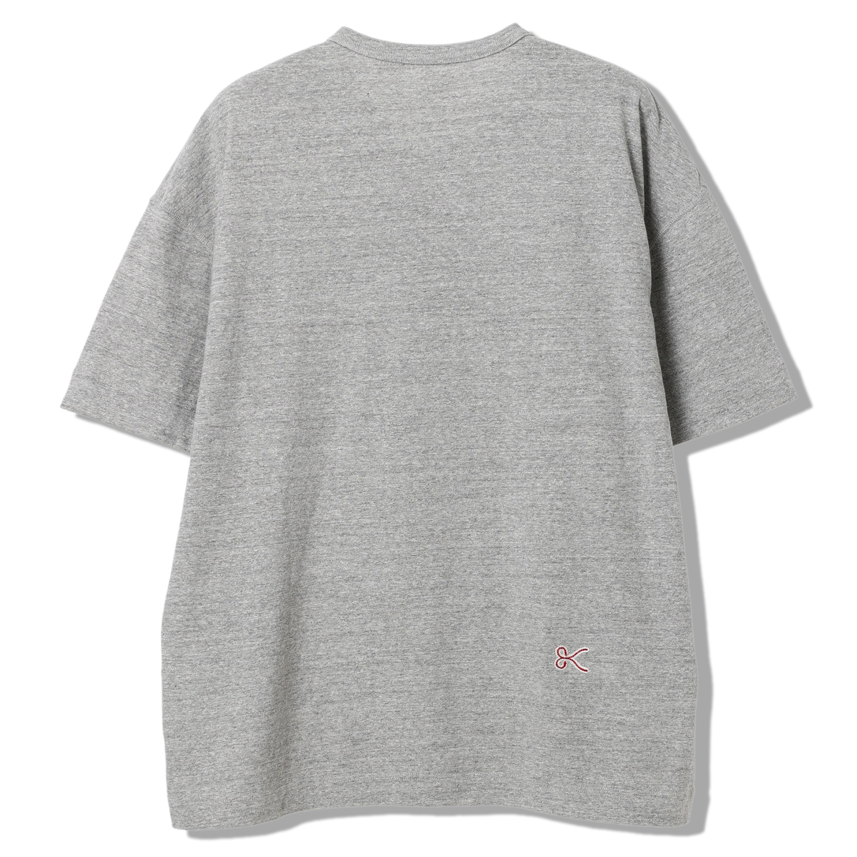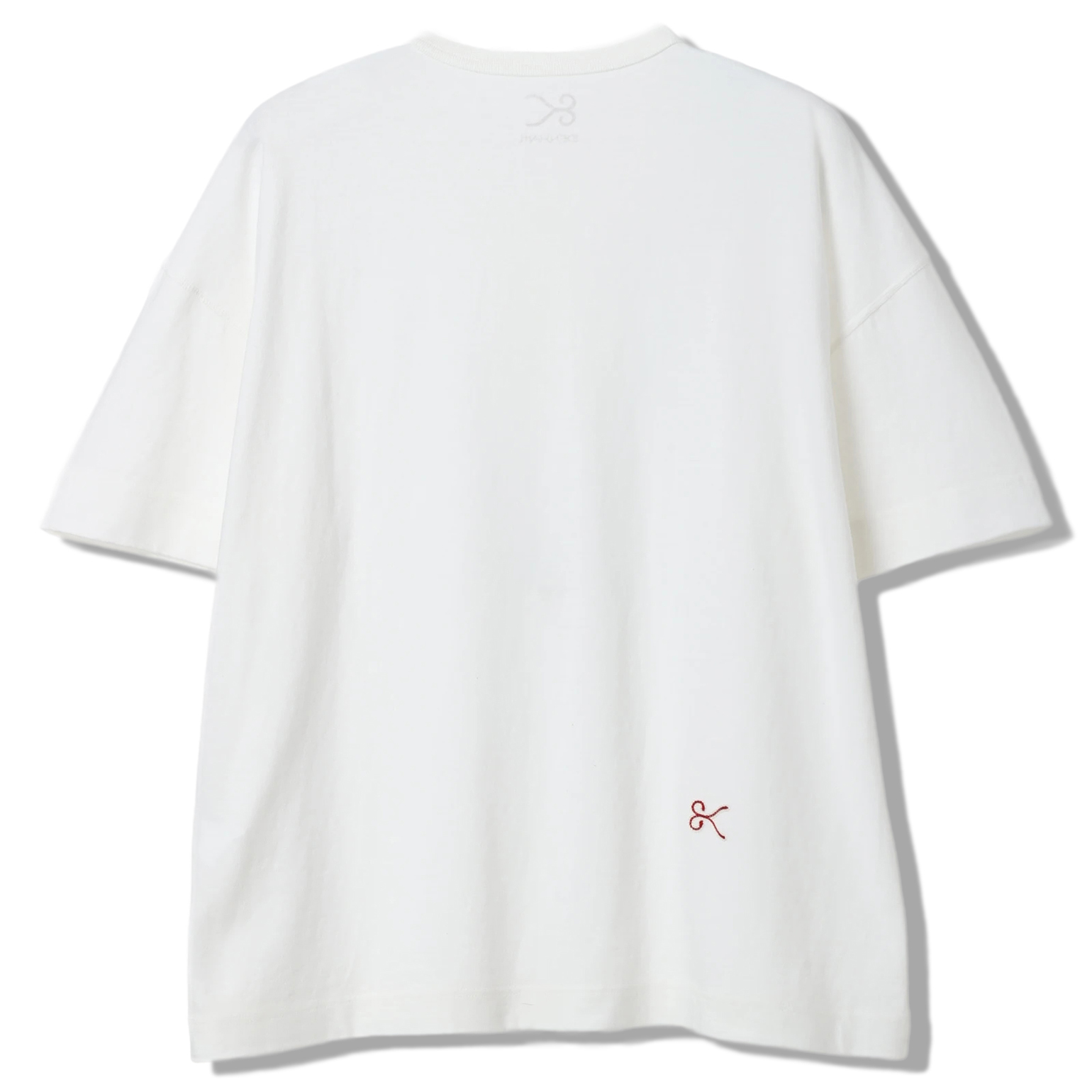 製品にしてから丁寧に洗いをかけて、お客様が着用された時にすでに馴染んでいるような、⾃然なムラ感を⽣かしたナチュラルなスラブ天竺のカットソー。製品にしてから洗いをかけ、10⽇間の天⽇⼲しをすることにより、独特で柔らかな質感をもたらします。シンプルながらもこなれ感のあるルーズなシルエットが特徴。製品の右後⾝に施されたハサミの刺繍は、独⾃のデザインであり、製品に個性と特別感を与えています。