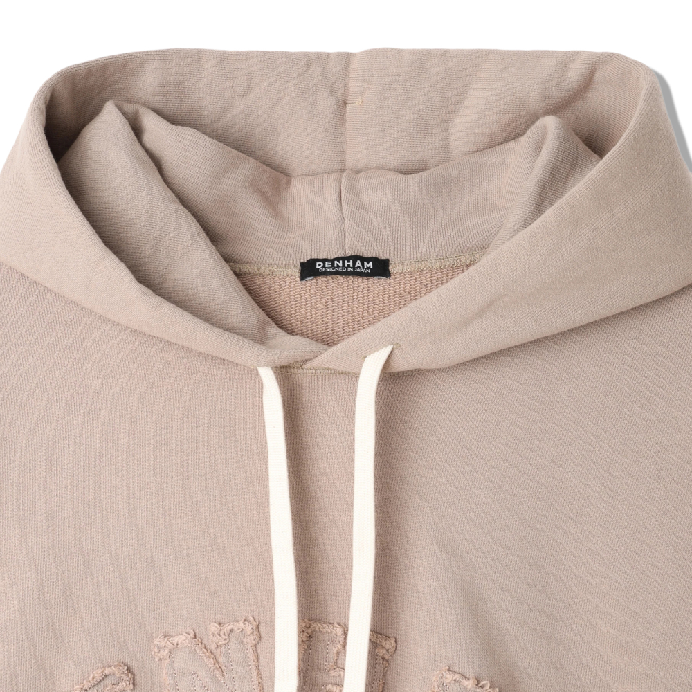 ブランドロゴ部分は職人が一つひとつ手切りで仕上げ、手作業ならではの個性と温もりを感じられる1着です。全体にはヴィンテージ加工を施しながらも、ロゴの存在感はそのままに残しています。