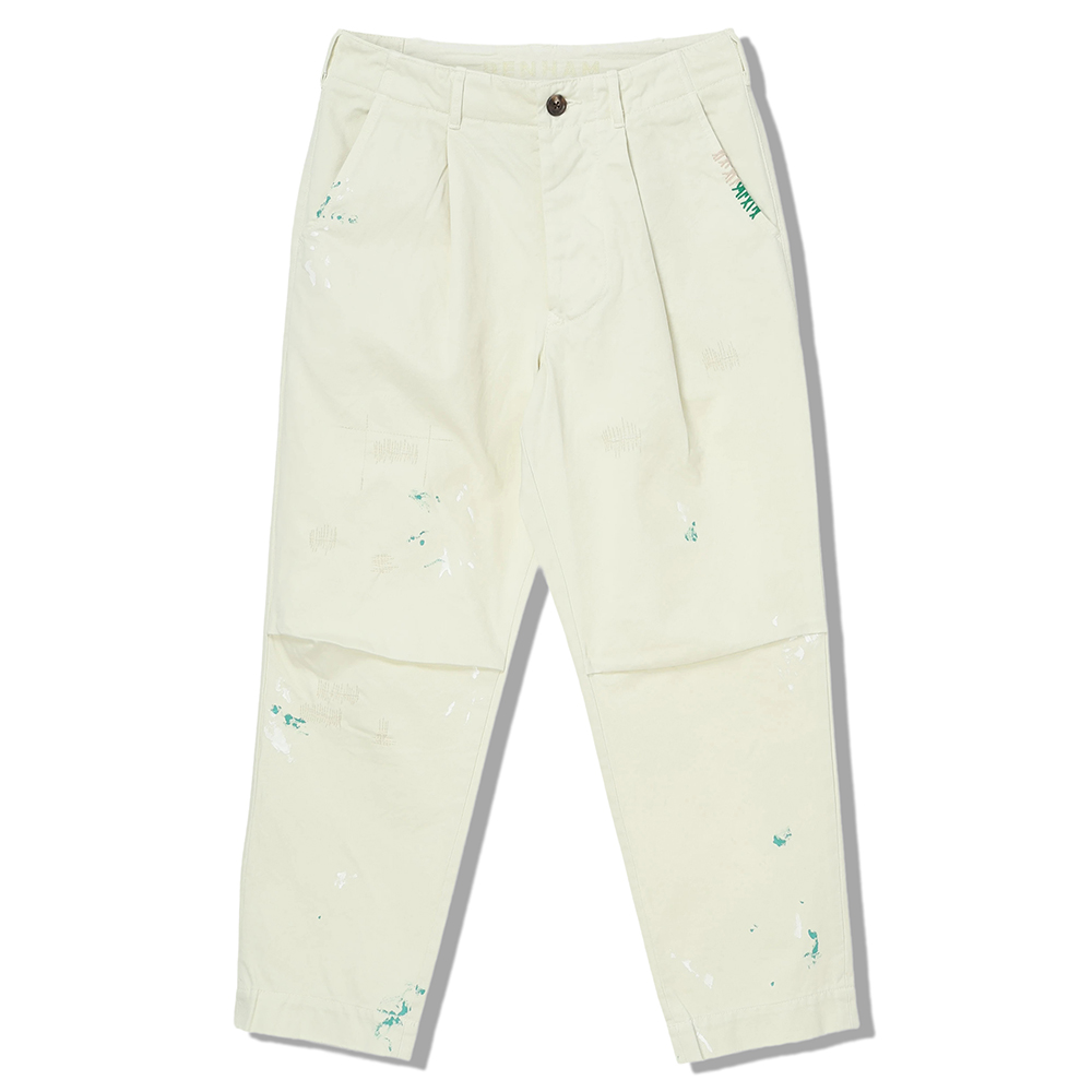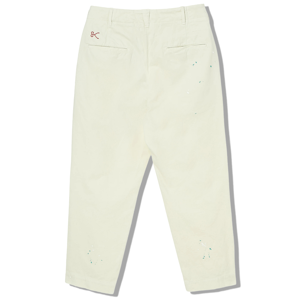 草木染めの柔らかな色合いをベースに、職人の手仕事によるクラフト加工とダメージペイントを施した至高のチノパンツです。製品完成後に洗いをかけることで、機械的な加工では決して出せない奥深い風合いと、肌に吸い付くような柔らかな質感を一から引き出しました。穿き込むほどに色が褪せ、持ち主の体に馴染んでいく「自分だけの一本」への経年変化を贅沢に味わえます。 デザインはアメリカンヴィンテージの無骨さをベースに、タックやシルエットの構築にはユーロヴィンテージの洗練された要素を融合。古き良きスタイルを現代的に再解釈した、気品漂う佇まいに仕上げています。 バックポケット上部にはブランドを象徴するa IN Uオリジナルのシザース刺繍を配置。使用しているムライト製の生地は、確かな張りがありながらもしなやかで、ハードな使用環境にも耐えうる耐久性と動きやすさを兼ね備えています。日常に溶け込みながら、着るたびに愛着が深まるマスターピースです。