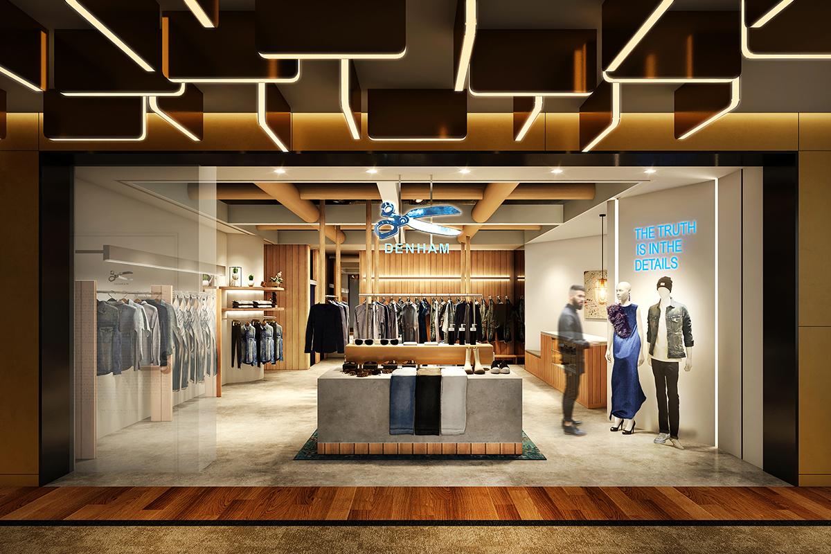 DENHAM 六本木ヒルズ店では、白い壁とコンクリートの洗練された雰囲気に木材の柔らかい表情を重ねあわせたモダンな店内を演出。そこにはインディゴのヴィンテージカーペットや、コンセプトである”THE TRUTH IS IN THE DETAILS”のサインがアクセントに。デニムウォールには、ブランドのアイコンであるシザースが並び、ブランドの核となるプレミアムデニムを展開します。メンズ・ウィメンズ共にデニムを中心としながら、シーズンごとのコレクションが並ぶ店内は、ゆったりとショッピングが楽しめる落ち着いた空間となっています。